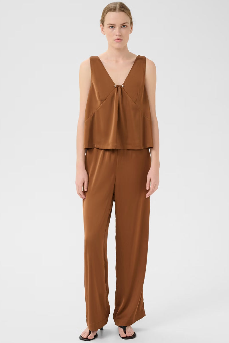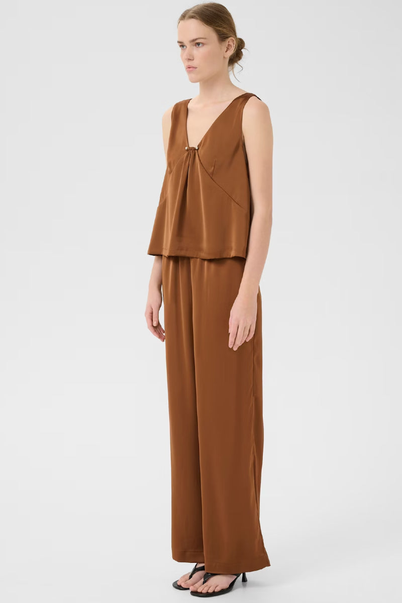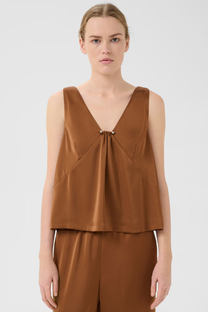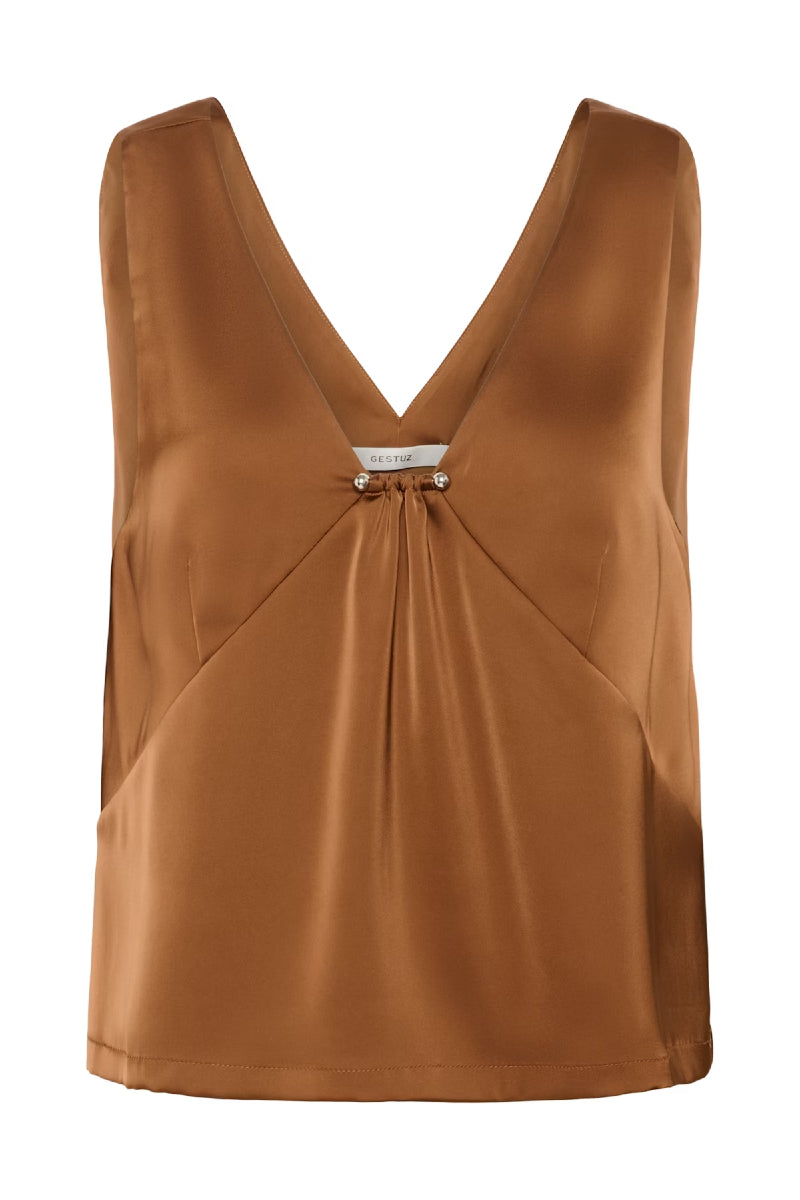 Elegantti toppi tanskalaiselta Gestuzilta. Tässä hihattomassa paidassa on syvä V-pääntie, rento istuvuus sekä kevyesti laskeutuva helma joka luo ilmavan siluetin. Etuosan laskokset ja pienet metallinapit viimeistelevät kokonaisuuden. Voit yhdistää tuotteen Gestuzin GZjessie-housujen kanssa luodaksesi yhtenäisen kokonaisuuden.