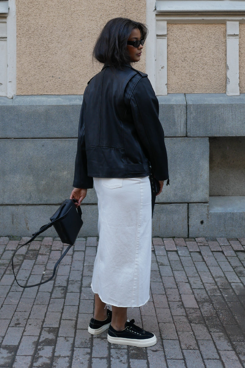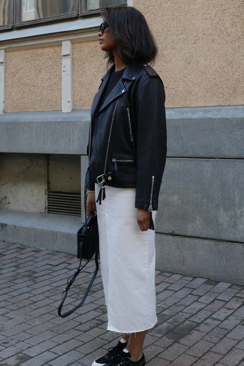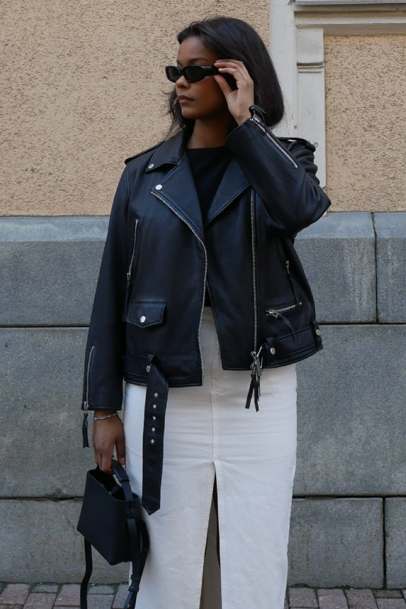 Laadukas nahkatakki tyylikkäällä cropatulla helmalla. Valmistettu kasviparkitusta lampaannahasta. Kauniin rennosti istuva nahkatakki on viimeistelty biker jacket yksityiskohdilla; helmavyöllä, vinolla vetoketjulla ja taskuyksityiskohdilla. Ylimitoitettu istuvuus, mutta pituudeltaan hieman lyhyempi malli.