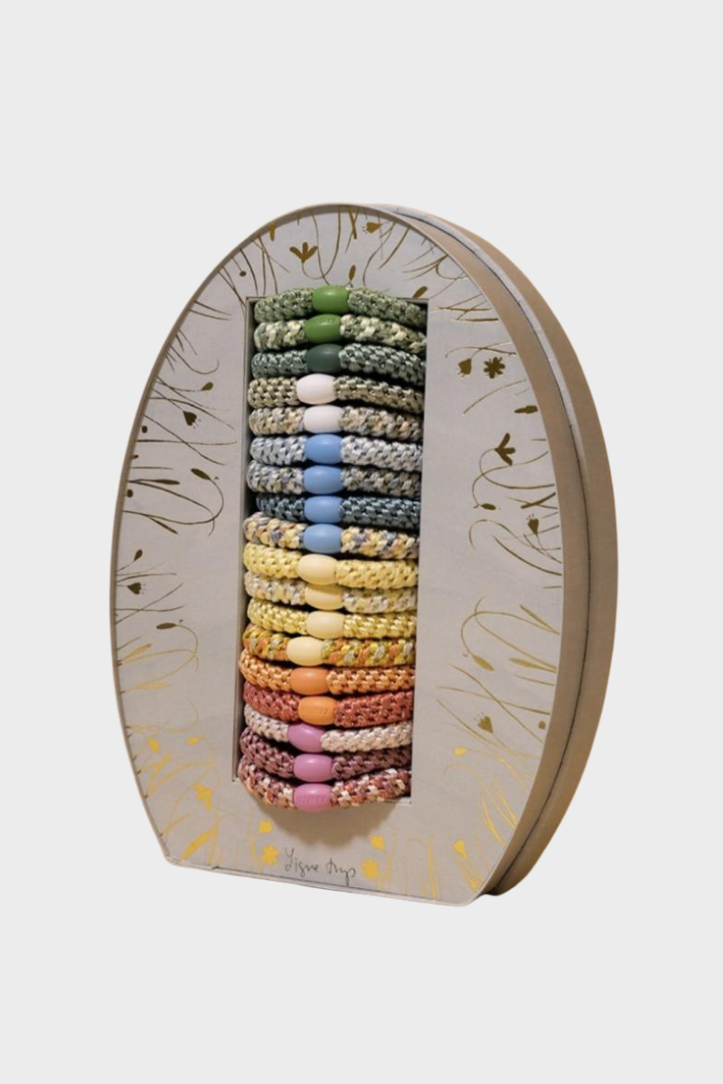 Kknekkin pääsiäisteemainen lahjapakkaus, joka sisältää 18 ikonista KKNEKKI-hiuslenkkiä huolella valituissa sävyissä juhlistamaan sesonkia. Norjalaisen taiteilijan Signe Torpin kuvittama design on samaan aikaan leikkisä ja elegantti, inspiroituneena talven ja kevään taianomaisesta siirtymästä.