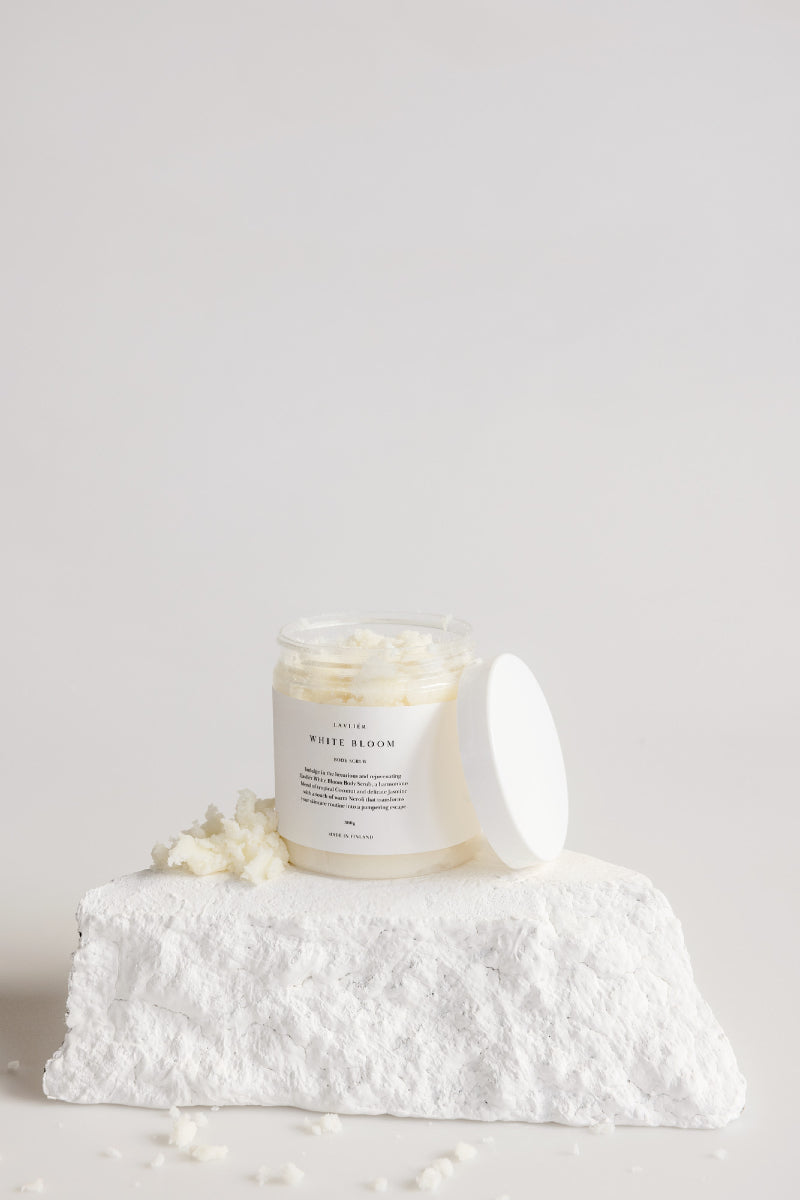 Lavliér White Bloom Body Scrub -vartalokuorintasuolan tyylikäs pakkaus tuo kylpyhuoneeseen ripauksen hienostuneisuutta.