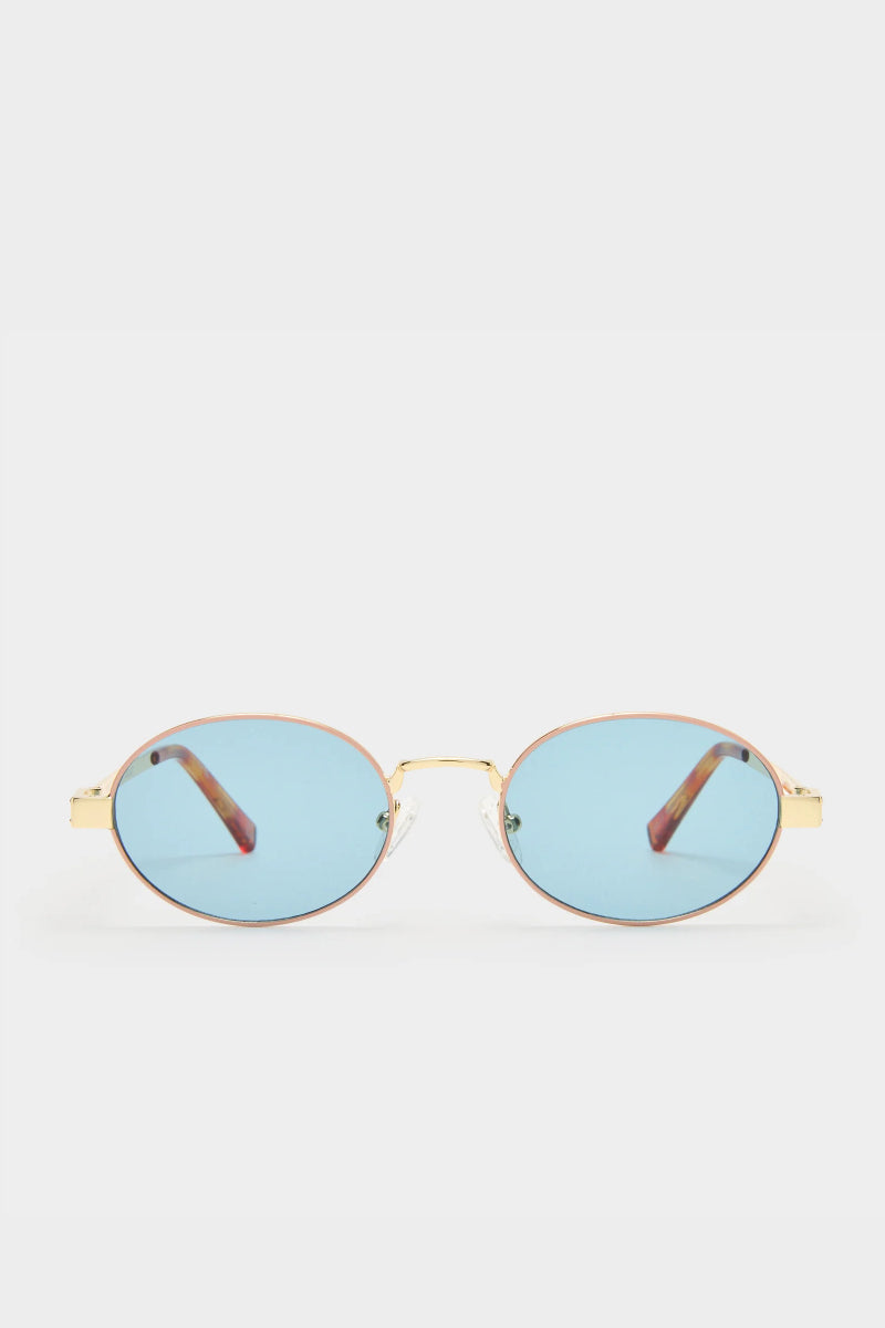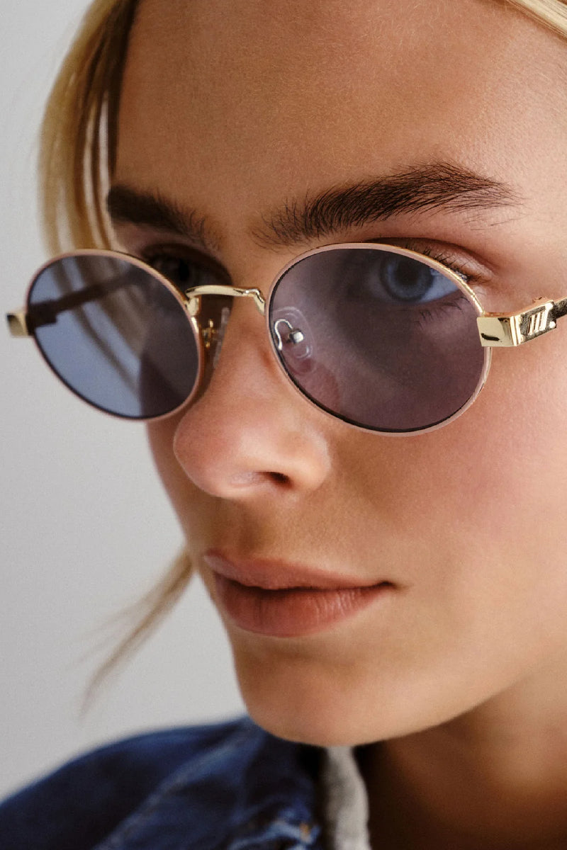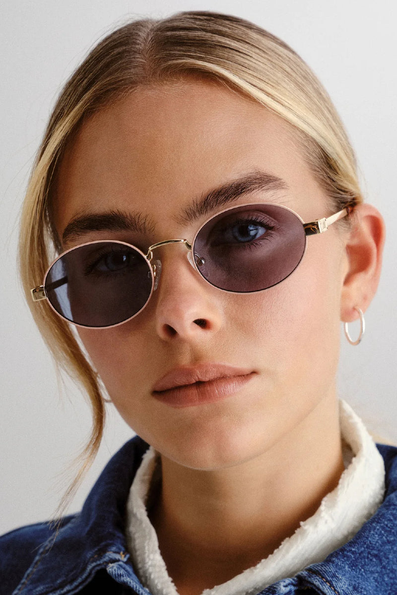 Minimalistinen 90-luvun alkua henkivä aurinkolasimalli kauniilla kultaisella kehyksellä. Laseissa ovaalit linssit sekä raitayksityiskohdat sangoissa jotka tuovat kehyksiin modernin ilmeen. Unisex-malli istuu kasvoille kauniisti ja säädettävät nenätyynyt takaavat yksilöllisen istuvuuden.