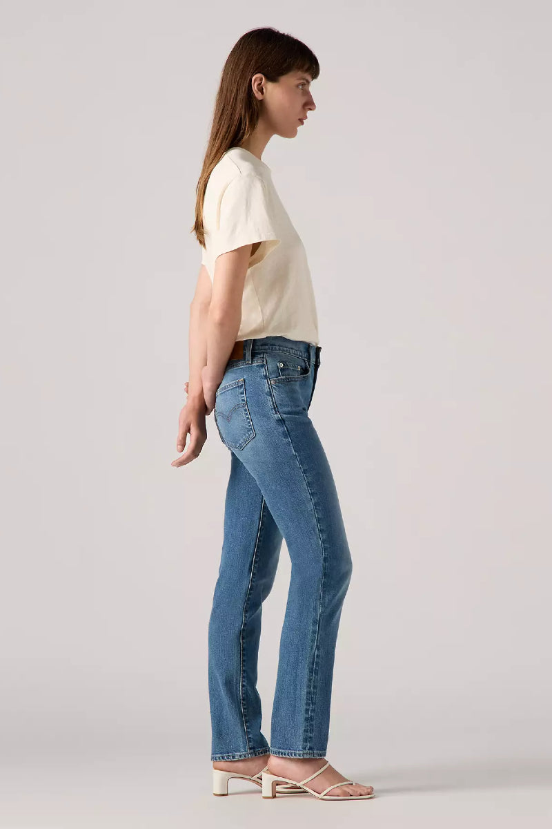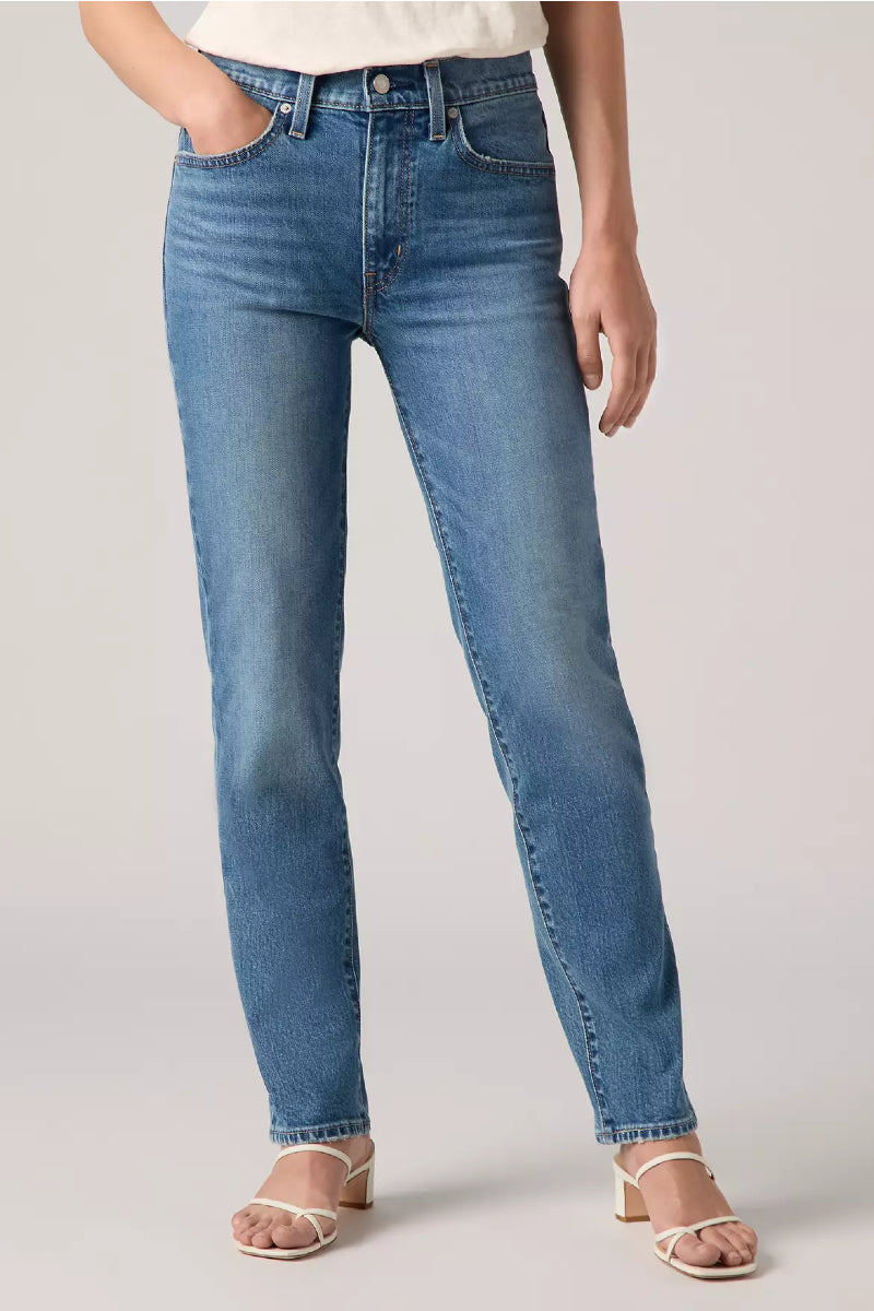 Kokopitkät farkut naisille Levikseltä. Materiaalina joustavaa ja erittäin miellyttävää denimkangasta. Farkuissa korkea vyötärö sekä suora, kapea lahje. Imarteleva slim fit-malli sopii monelle eri vartalotyypille. Monikäyttöinen keskisininen pesu.