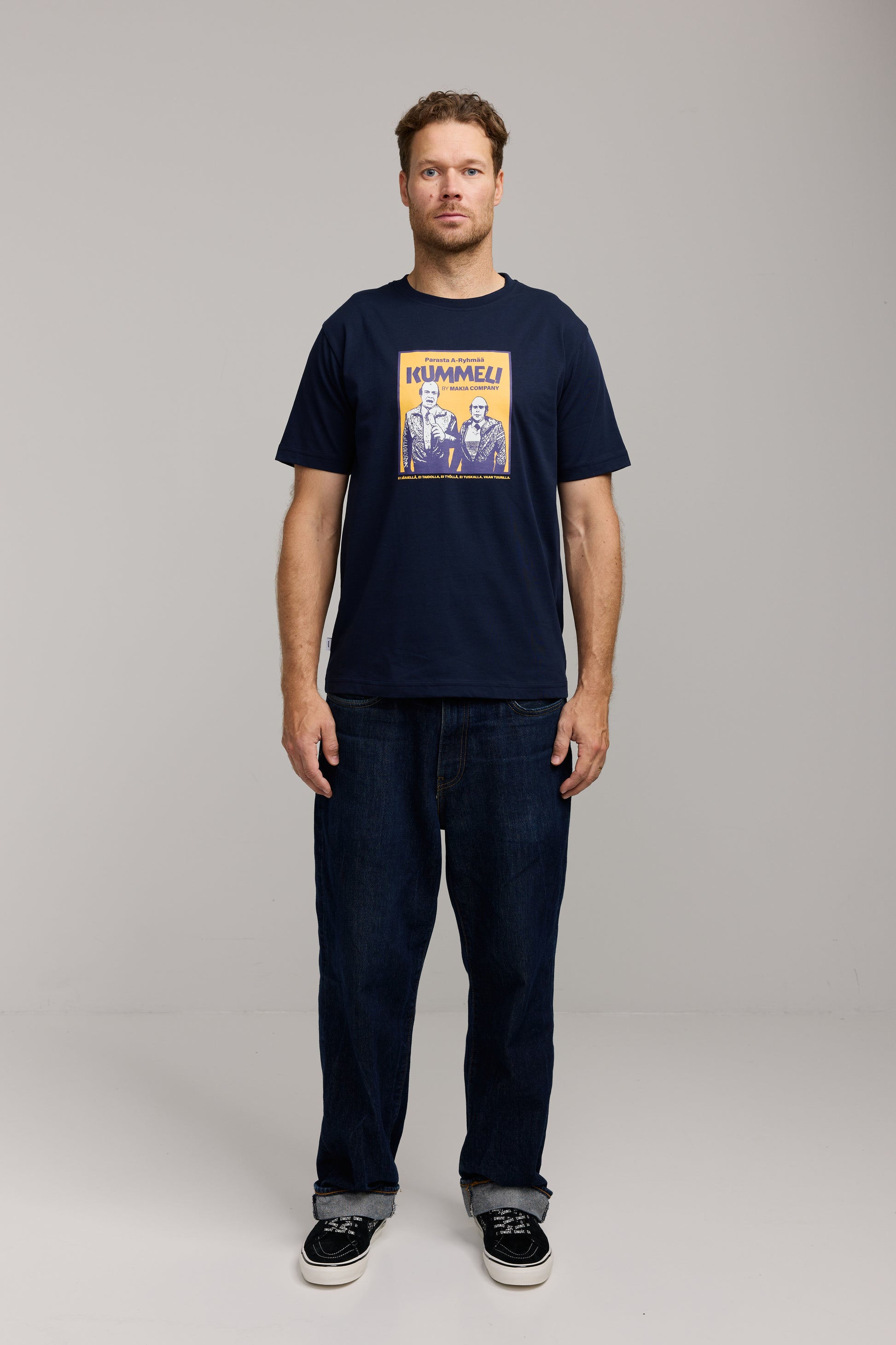 Makia x Kummeli-yhteistyömalliston t-paita. Edessä iso A-ryhmä -printti. Valmistettu kevyehköstä 150g/m2 jersey-kankaasta. Normaali istuvuus.