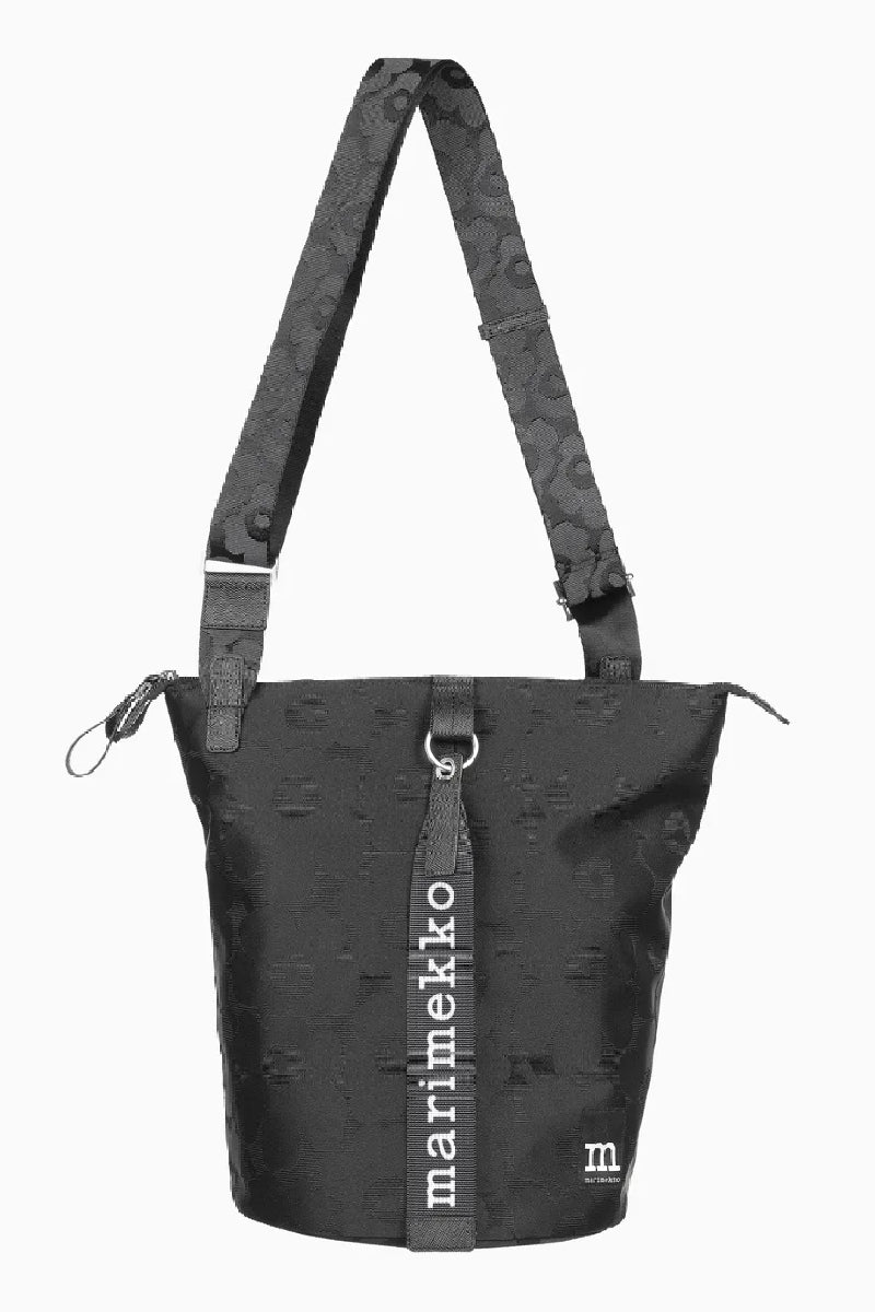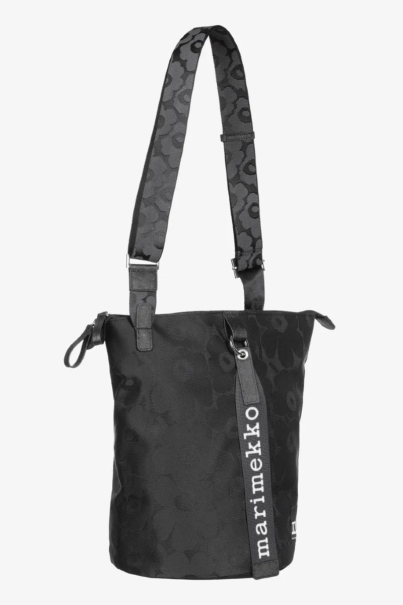 All Day Bucket -olkalaukku on valmistettu jacquard-kudotusta, Unikko-kuosisesta kierrätetystä polyesterista. Laukussa on kolme osastoa: yksi vetoketjulla suljettava ja kaksi avointa osastoa, joista toisessa on sisätasku. Laukussa on säädettävä olkahihna, jossa on jacquard-kudottu Unikko-kuosi. Etupuolelle on kiinnitetty Marimekko-avaimenperä ja takapuolella on yksi avoin tasku, joka sulkeutuu magneettinapilla.