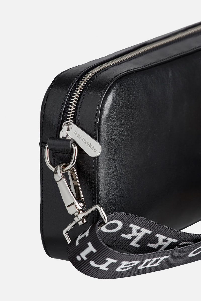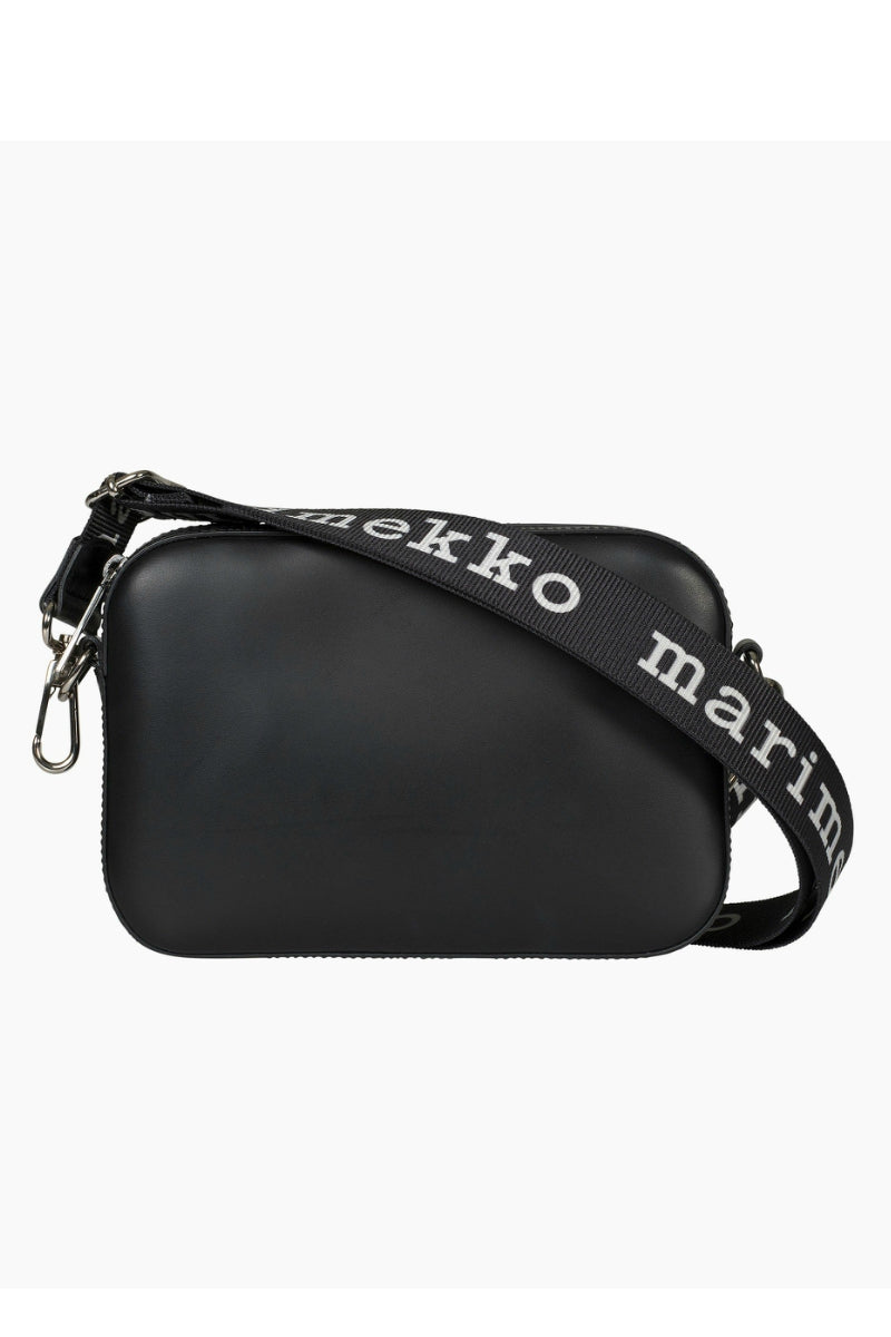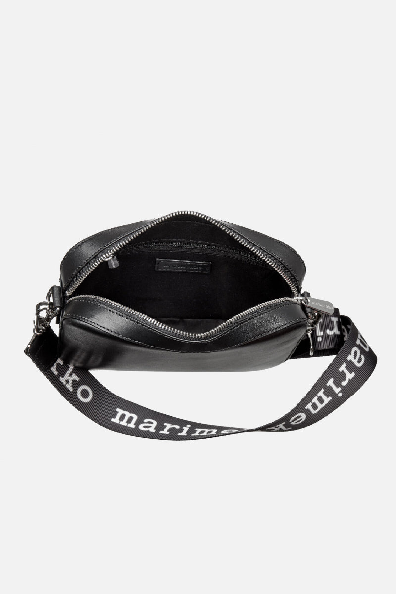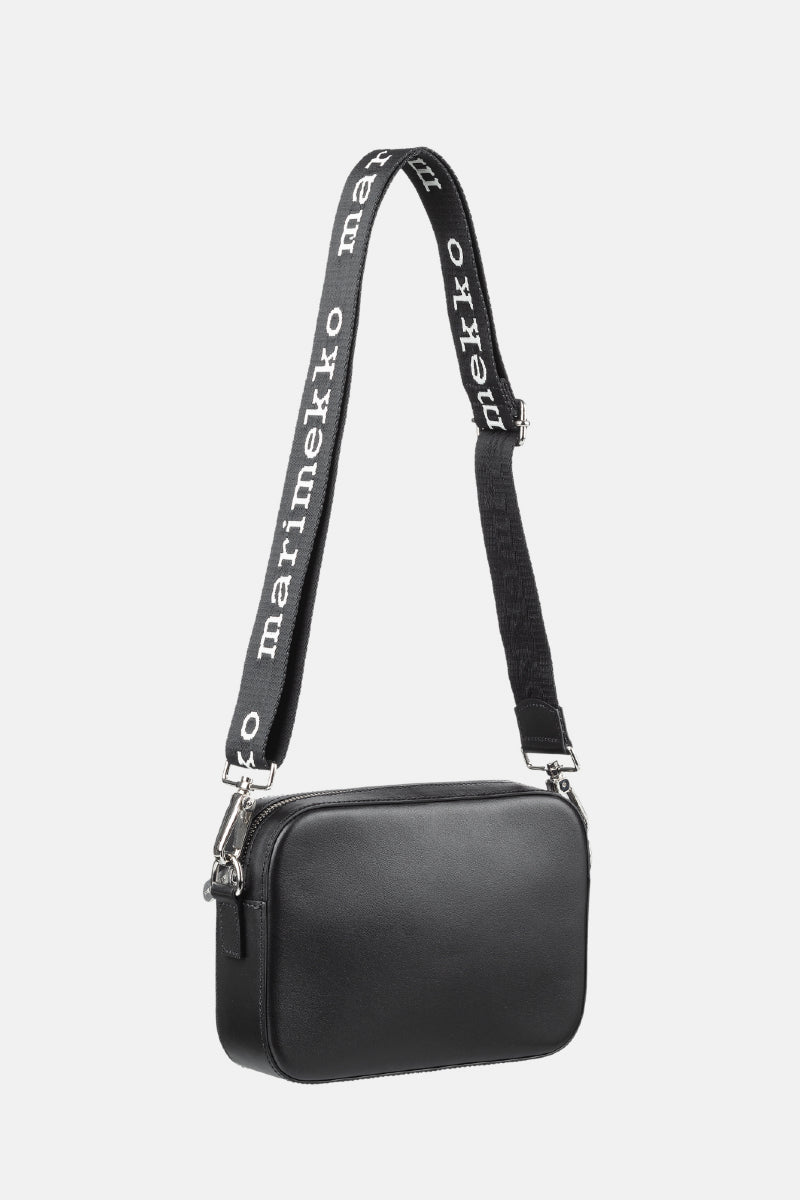 Italialaisesta nahasta valmistettu ikoninen Marimekon "kameralaukku" näyttävällä Marimekko-logoa toistavalla hihnalla. Laukussa on vetoketjusuljenta, se on vuoritettu ja sisäpuolella on vetoketjutasku.