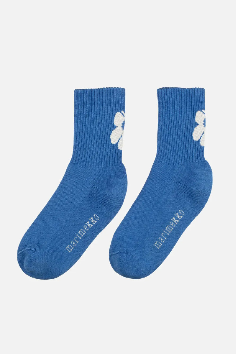 Puikea-tennissukat on valmistettu puuvillaseoksesta ja niissä on yksi Unikko-kuosin kukka takana sukan varressa.