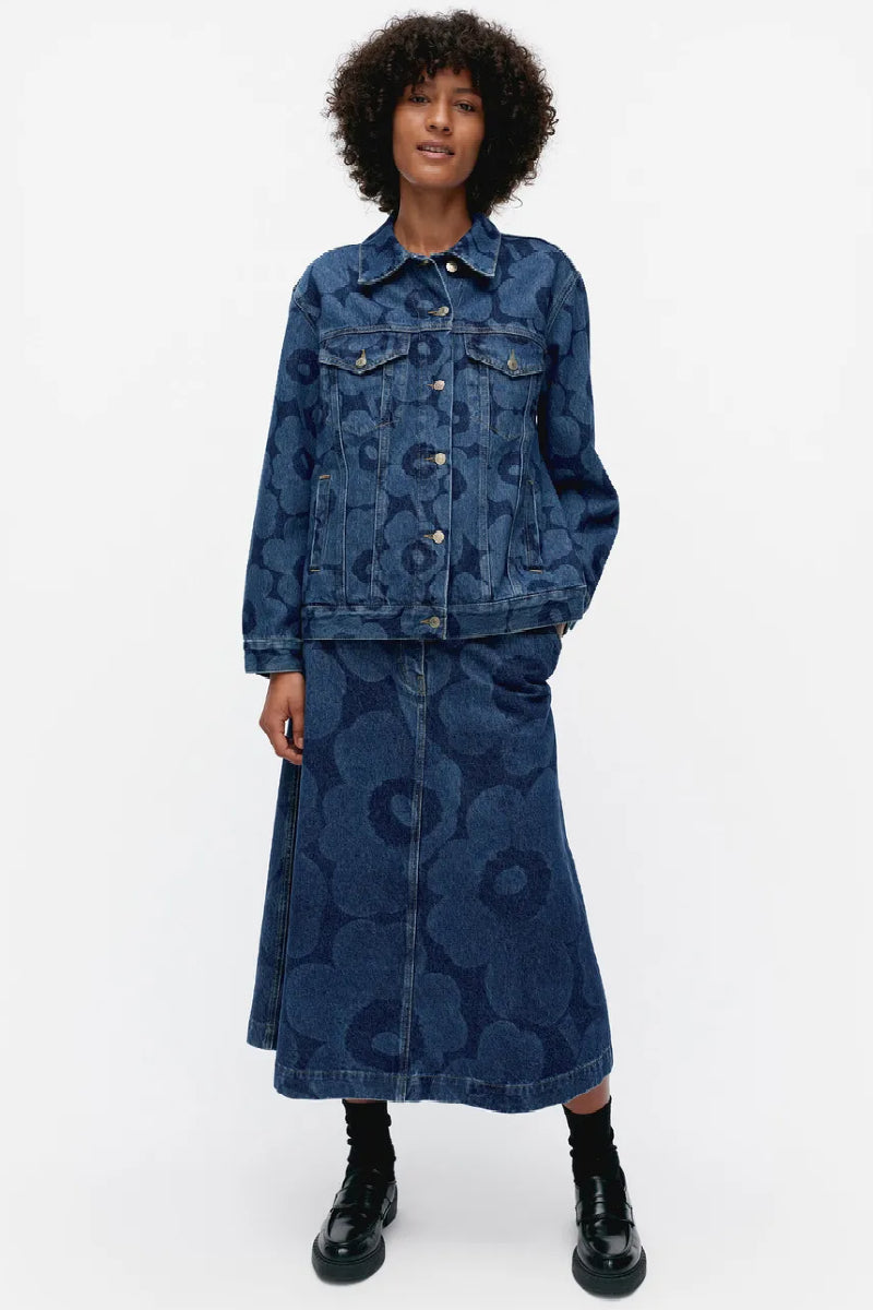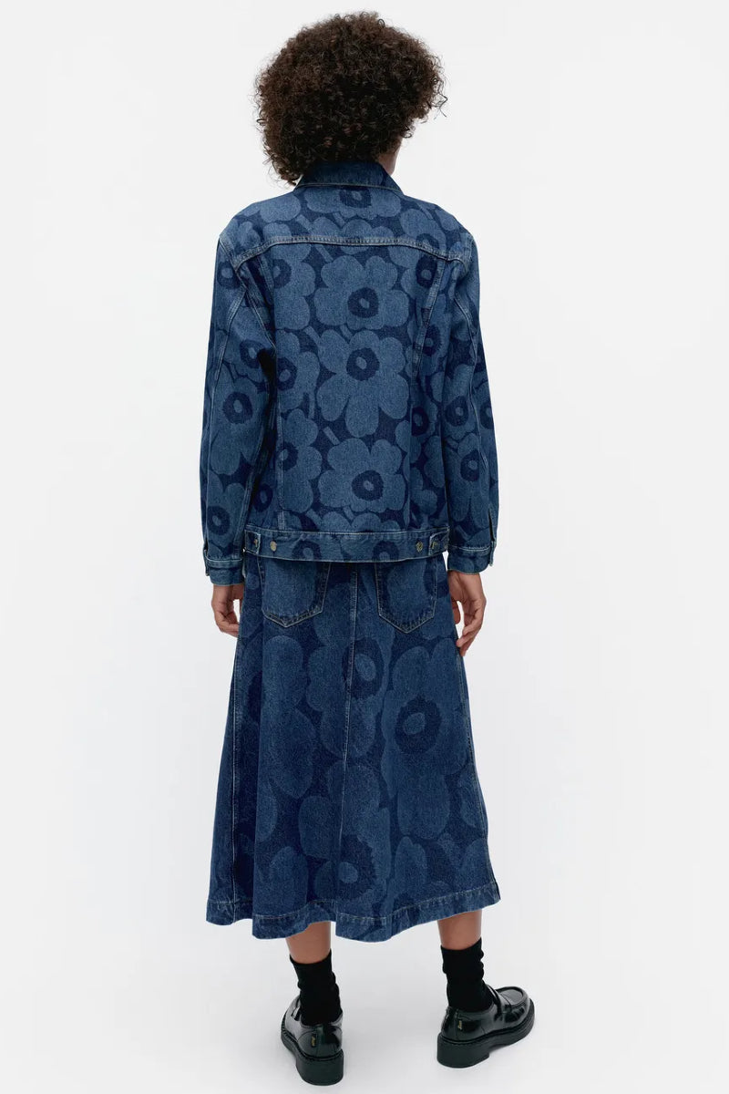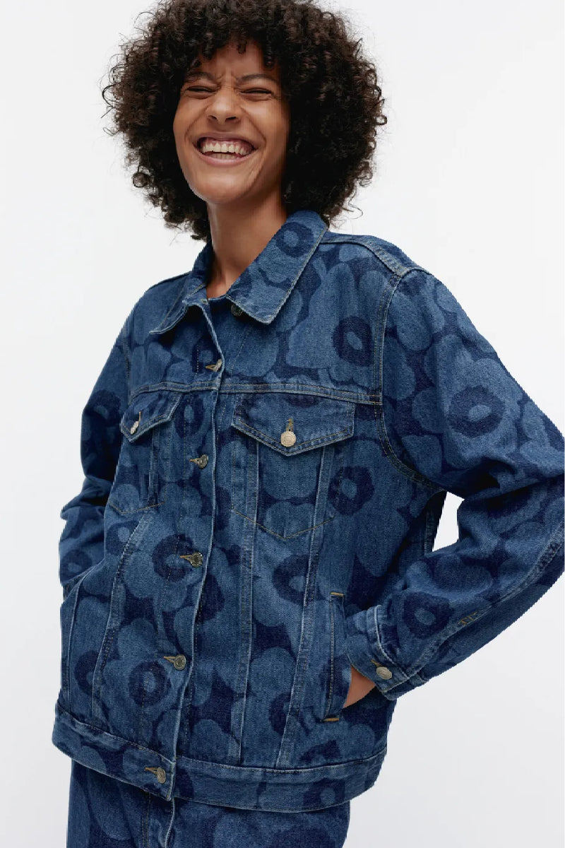 Sininen, Unikko-kuosinen Maridenim Murros -farkkutakki on valmistettu puuvillakankaasta, joka ei sisällä elastaania. Takissa on rento istuvuus, nappisuljenta, läpälliset rintataskut nappisuljennalla ja listataskut sivuilla. Edessä ja takana on kaarrokesaumat ja takana helmakaitaleessa on säädettävät tampit. Hihansuissa on napilliset mansetit ja takissa on Marimekko-farkkunapit.