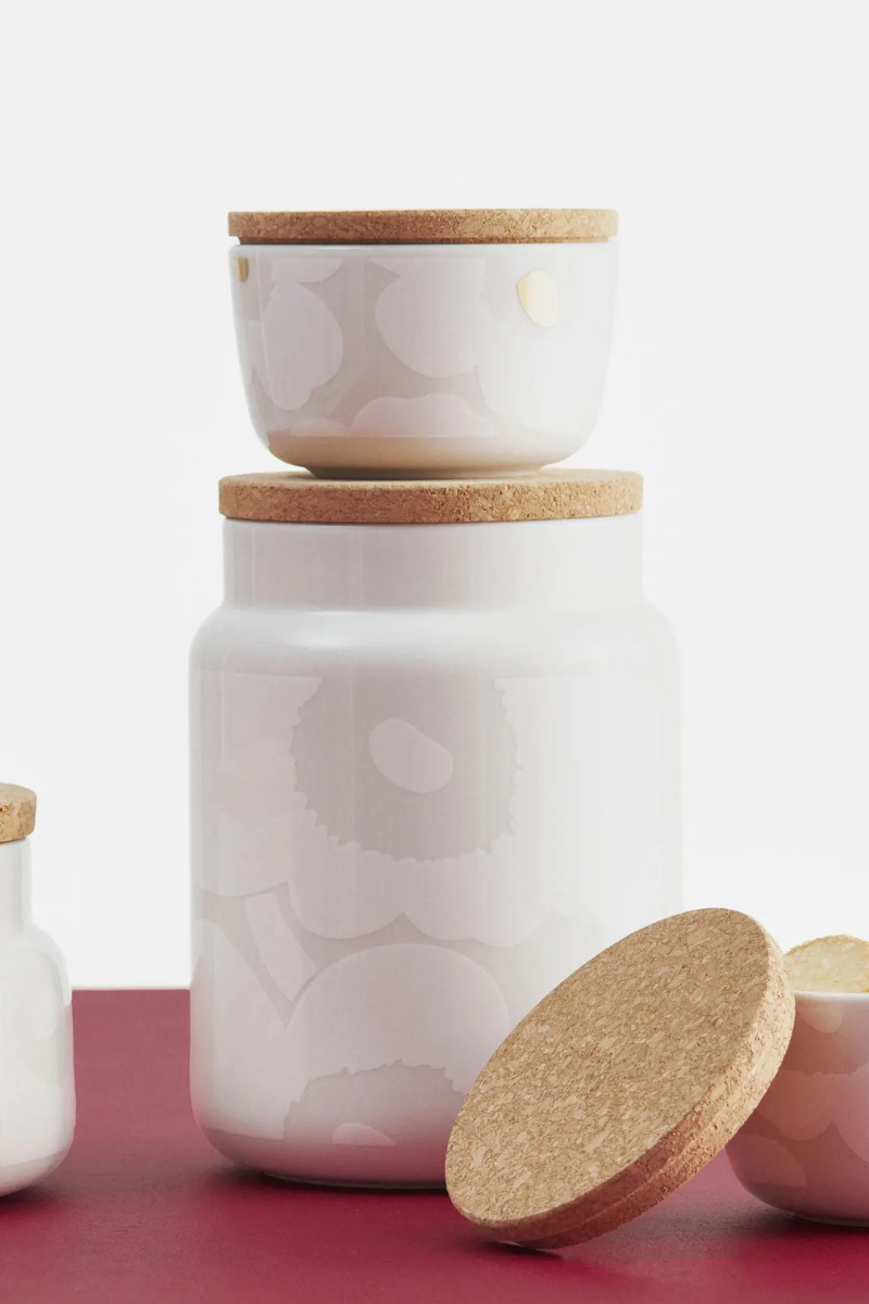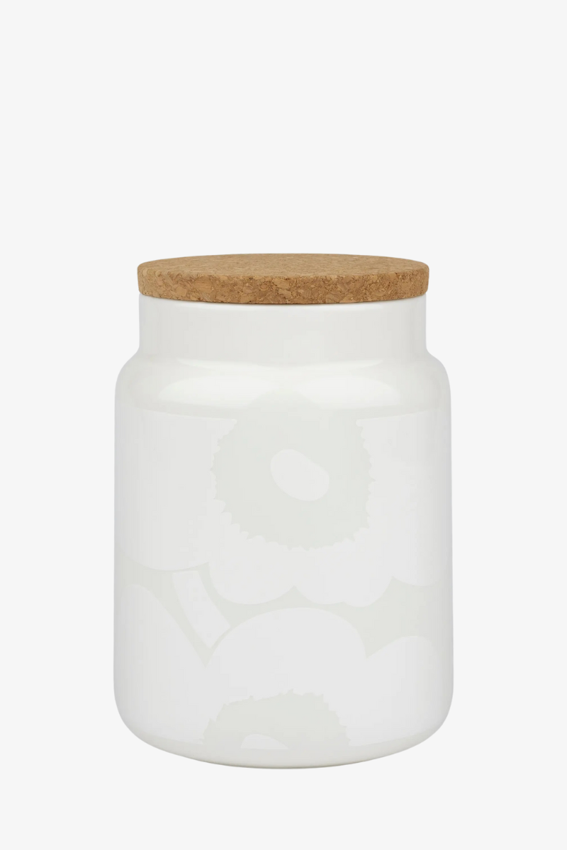 Valkoisella Unikko-kuosilla painettu säilytyspurkki on valmistettu valkoisesta keramiikasta. Purkissa on korkkikansi, jossa on Marimekko-logo sisäpuolella. Suosittelemme kannelle käsinpesua.