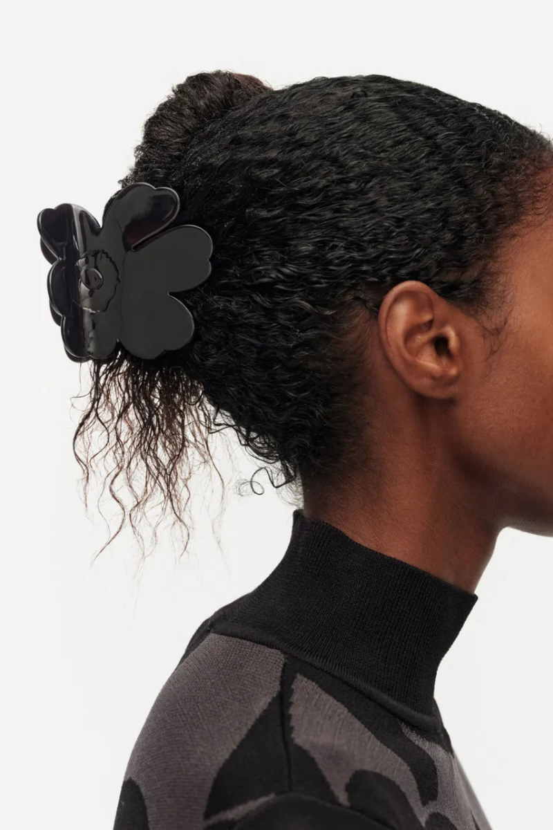Marimekon suuri Unikko-kukan mallinen hiusklipsi on valmistettu kierrätetystä akryylista.