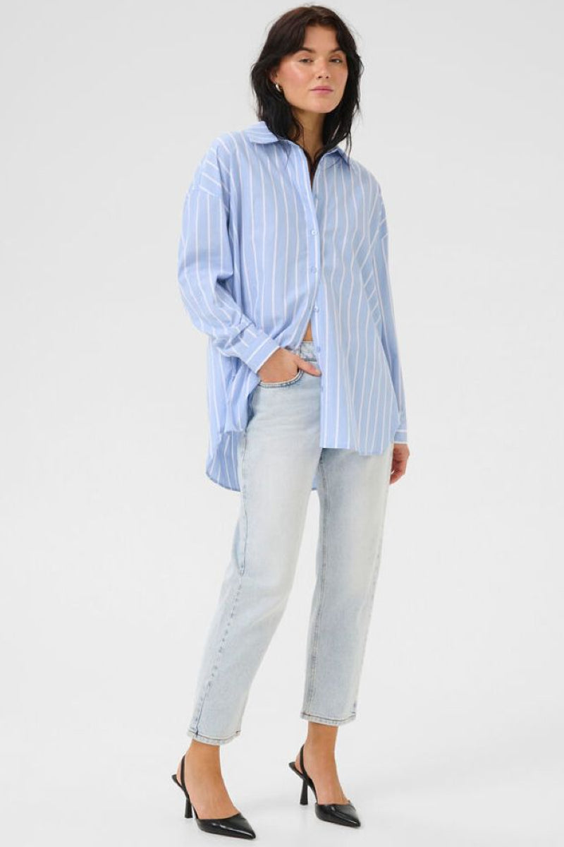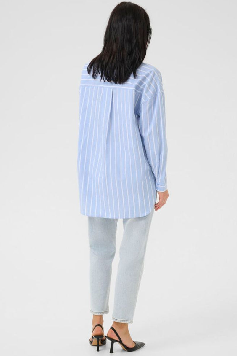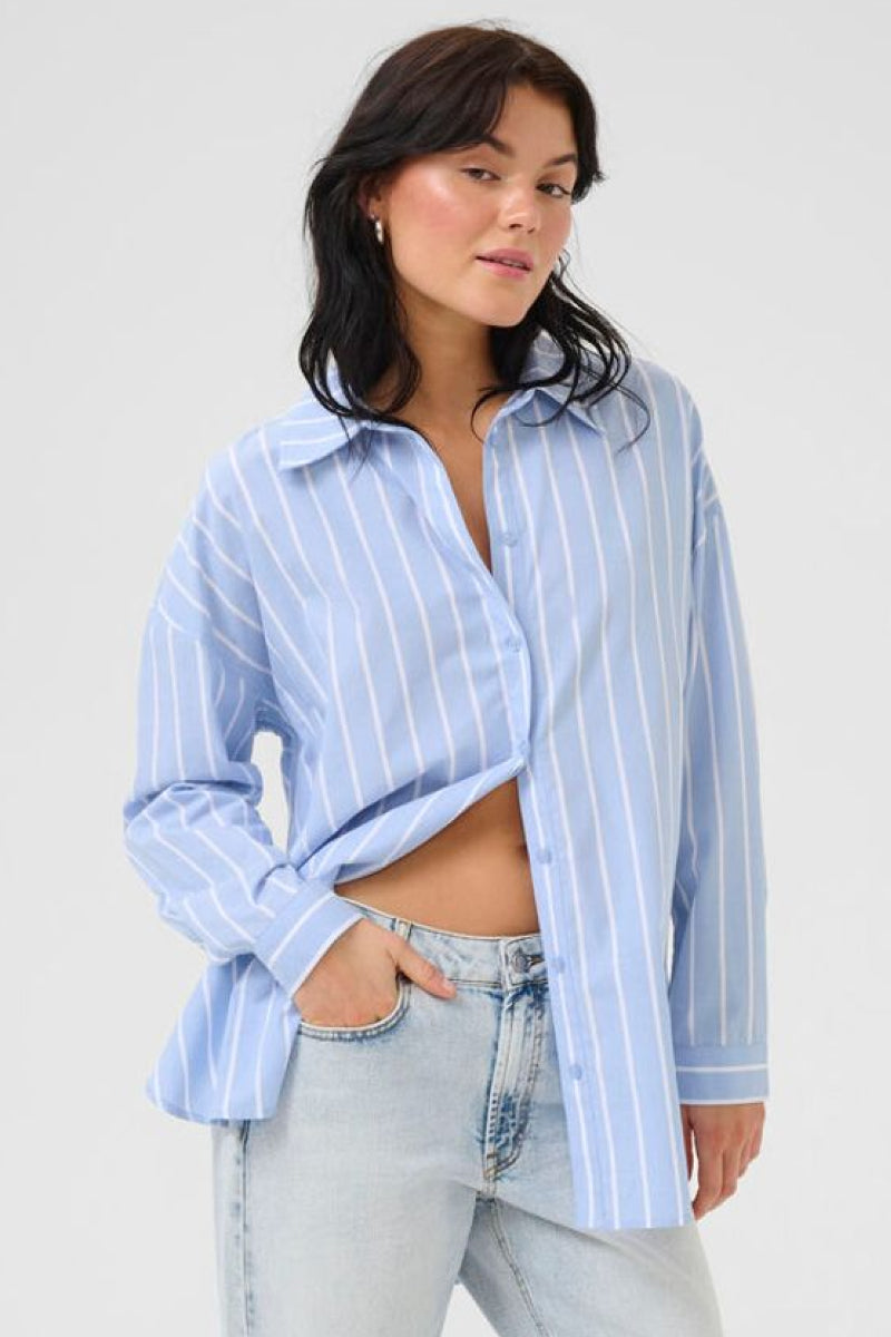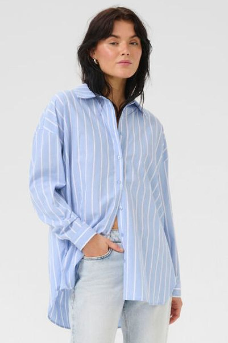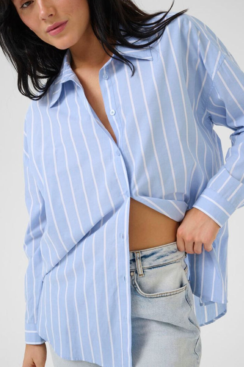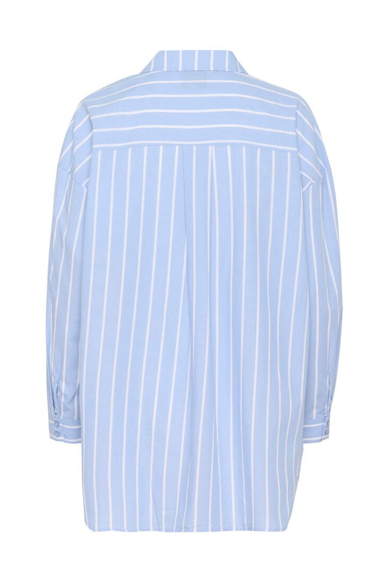 Raidallinen kauluspaita raikkaalla sinivalkoisella raitakuviolla. Paidassa on väljä mitoitus, laatikkomainen malli sekä pitkä, pyöristetty helma. Klassinen kaulus ja nappikiinnitys viimeistelevät kokonaisuuden joka sopii täydellisesti niin farkkujen kuin siistimpien alaosien kanssa.