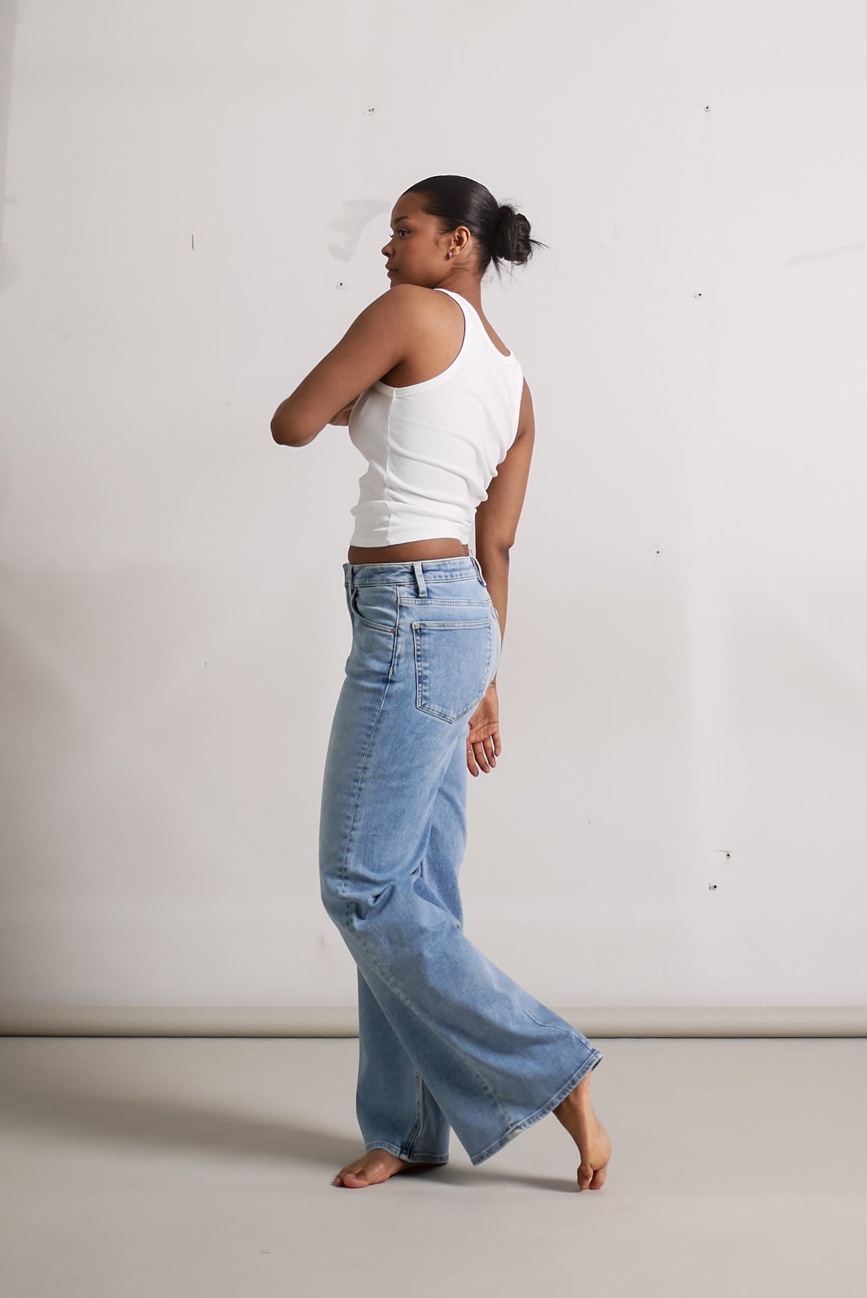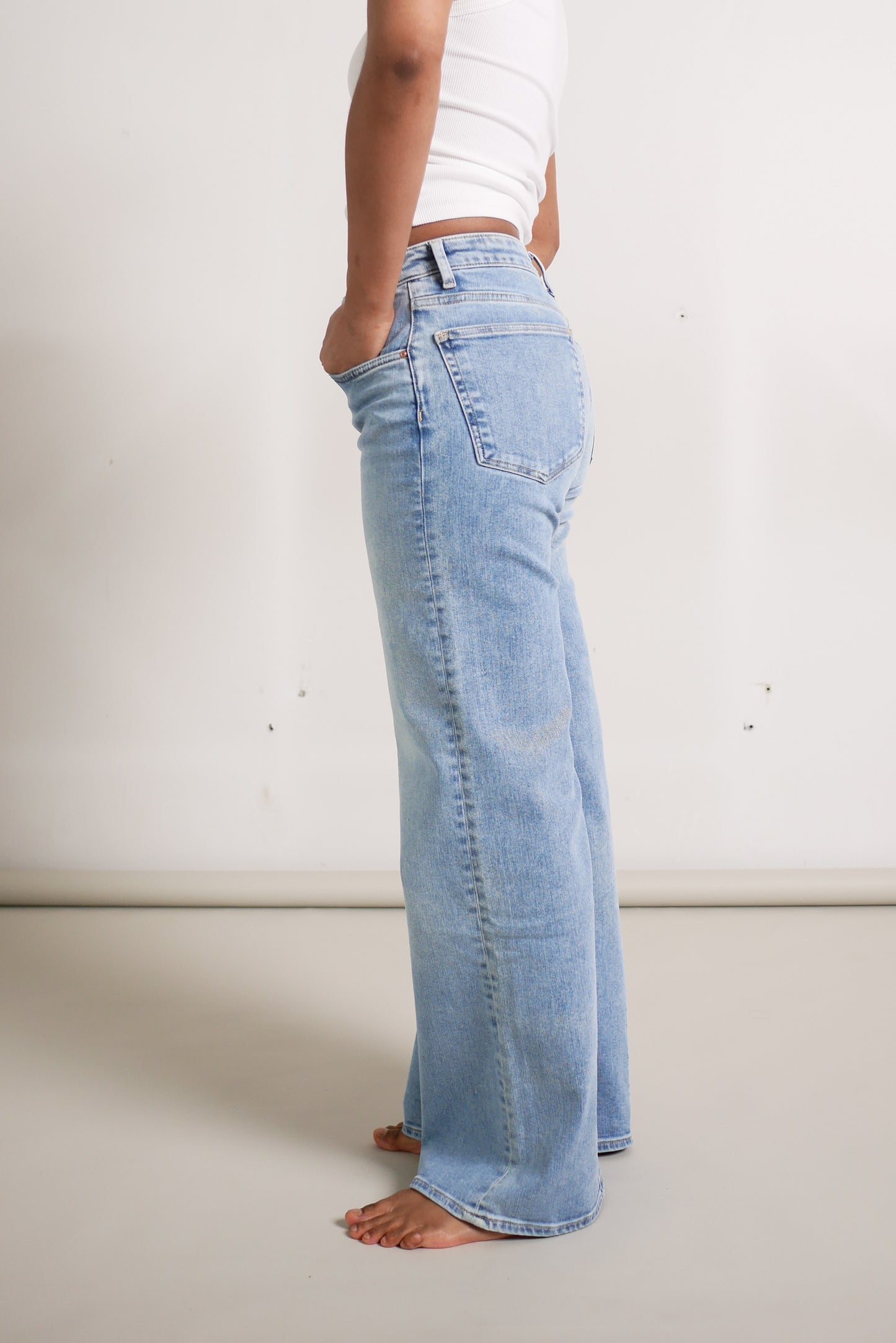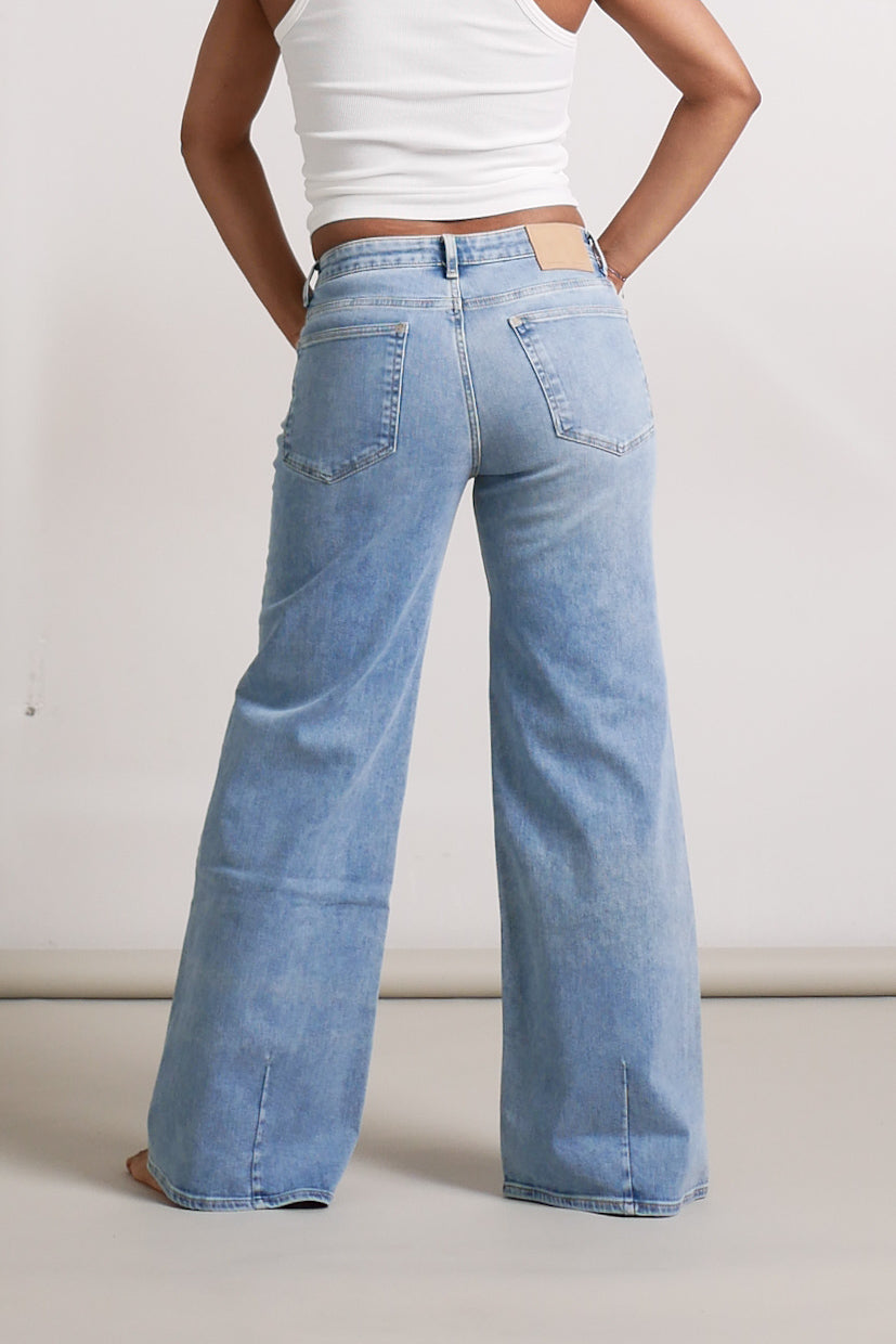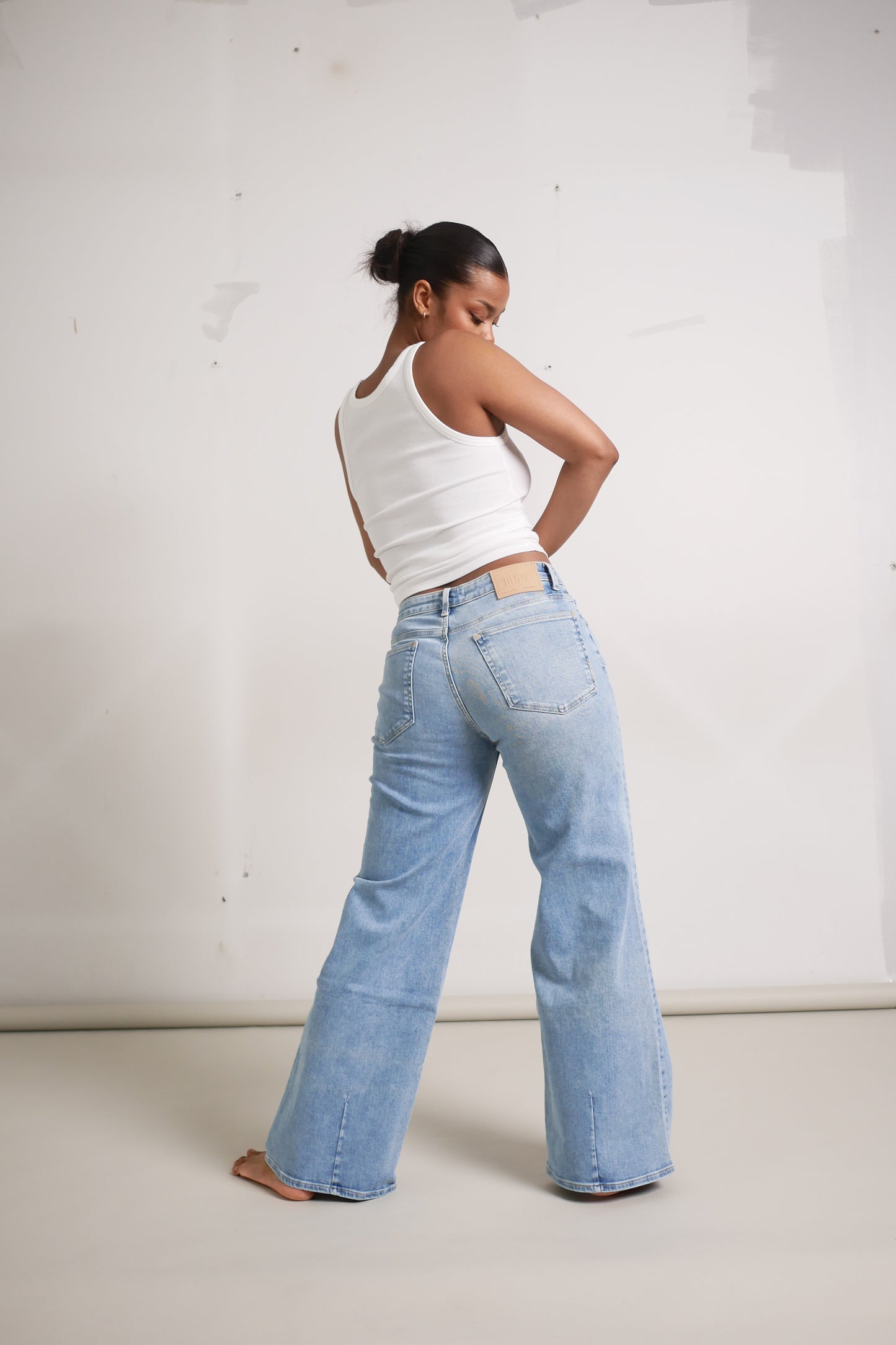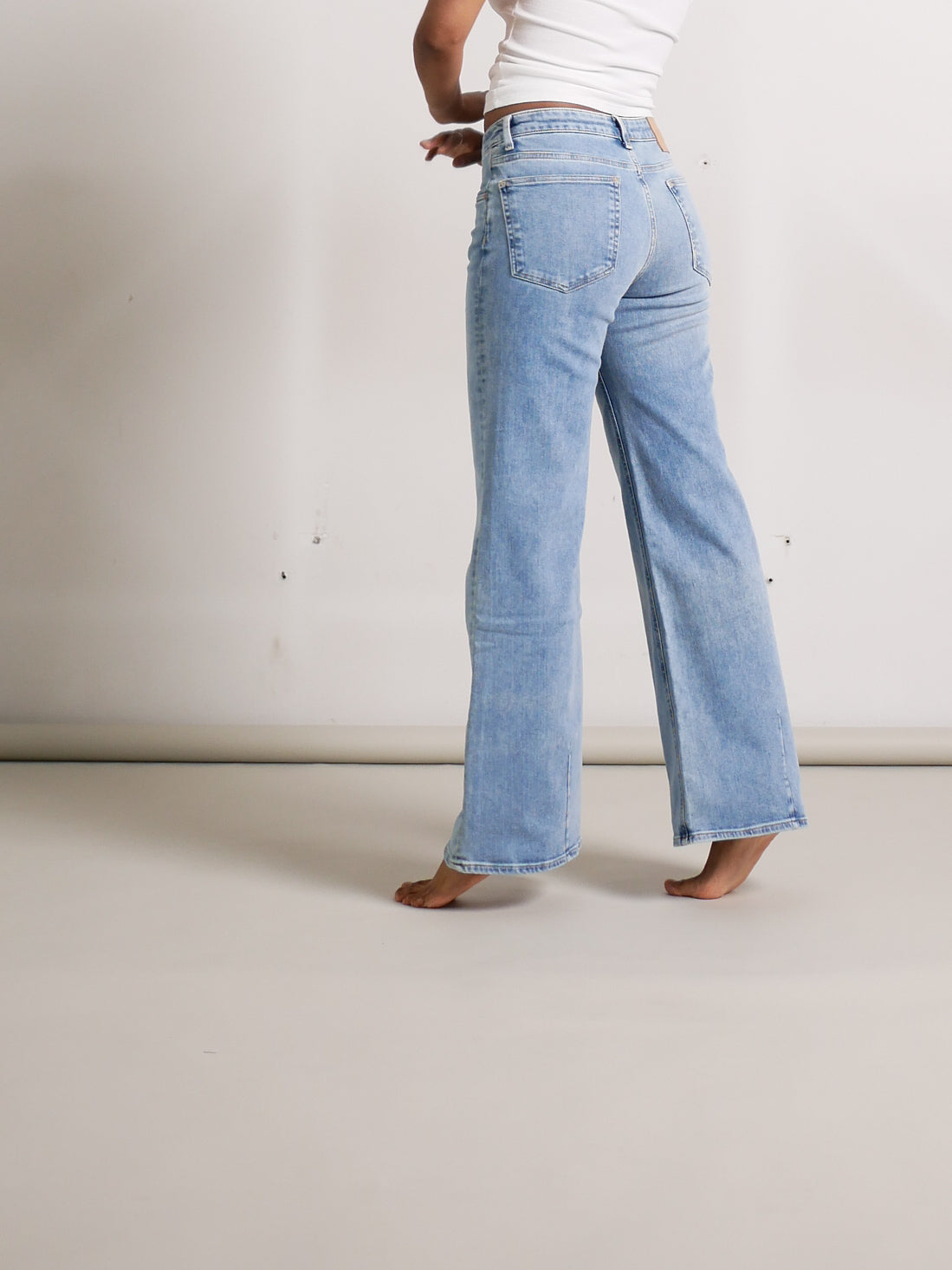 Naisten upeat leveälahkeiset farkut raikkaassa ja kulutetussa vaaleansinisen sävyssä. Farkuissa pitkät ja väljät lahkeet jotka levenevät A-mallisena polvesta alas sekä keskikorkea ja istuva vyötärö. Materiaalina jämäkkää denimkangasta joka joustaa hieman ja tekee farkuista mukavat päällä.