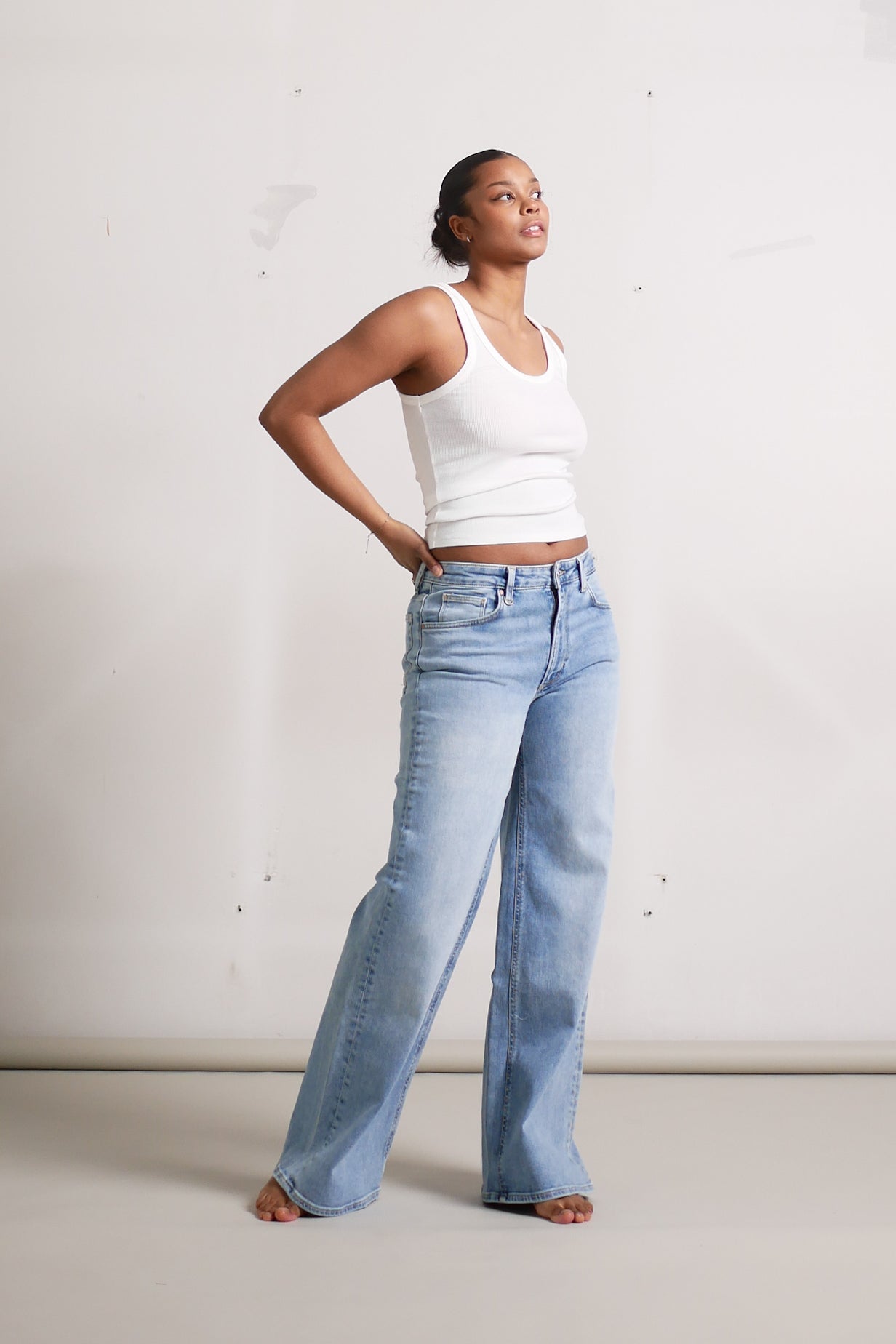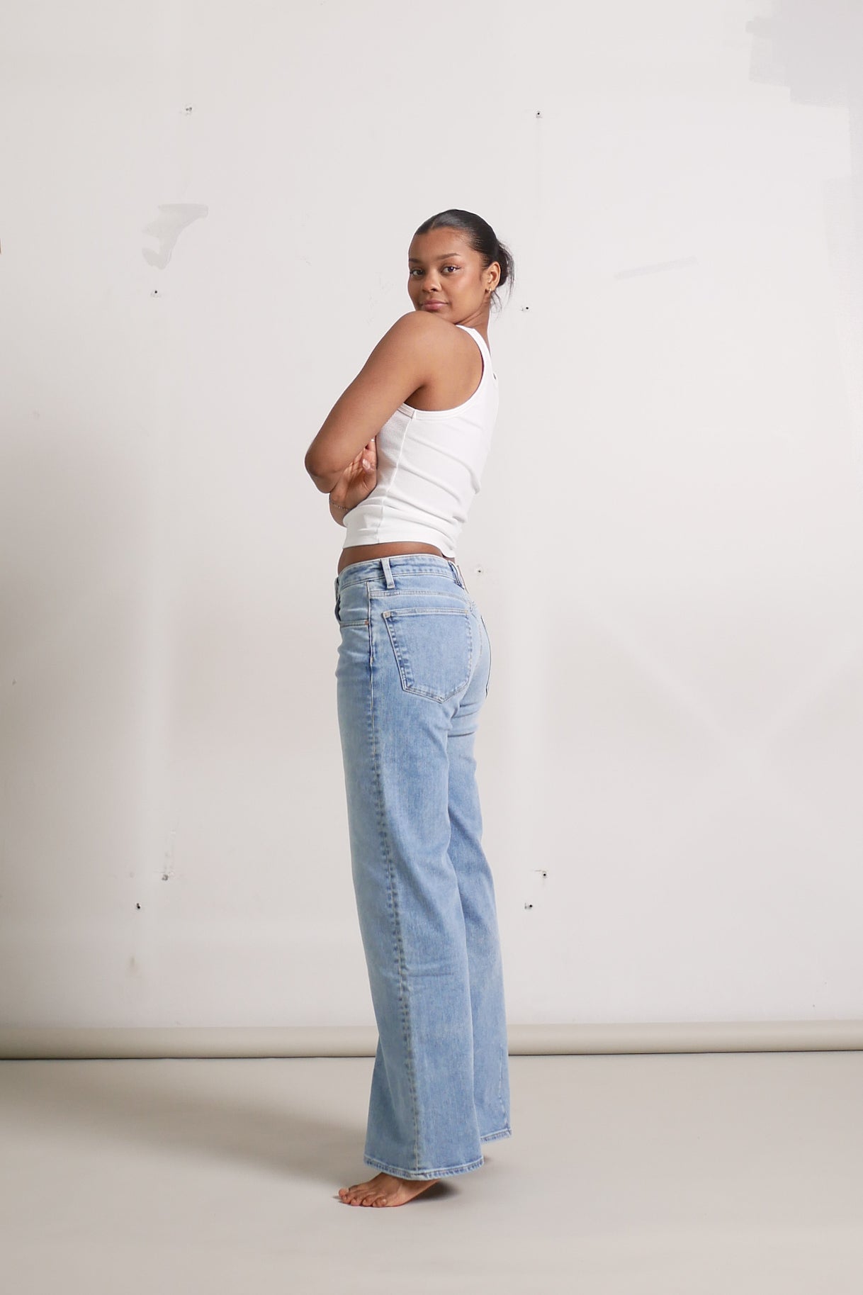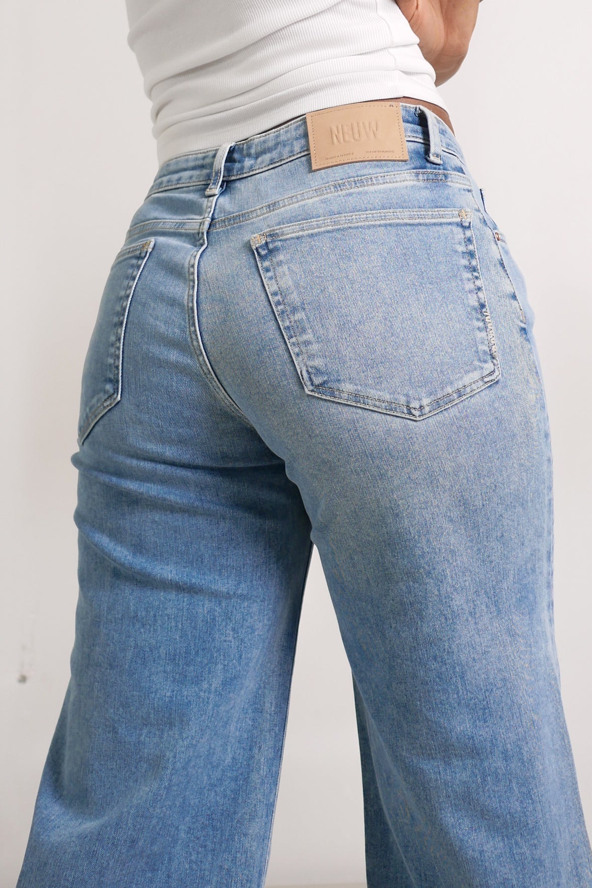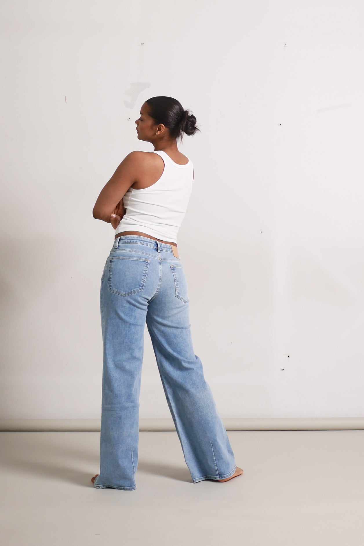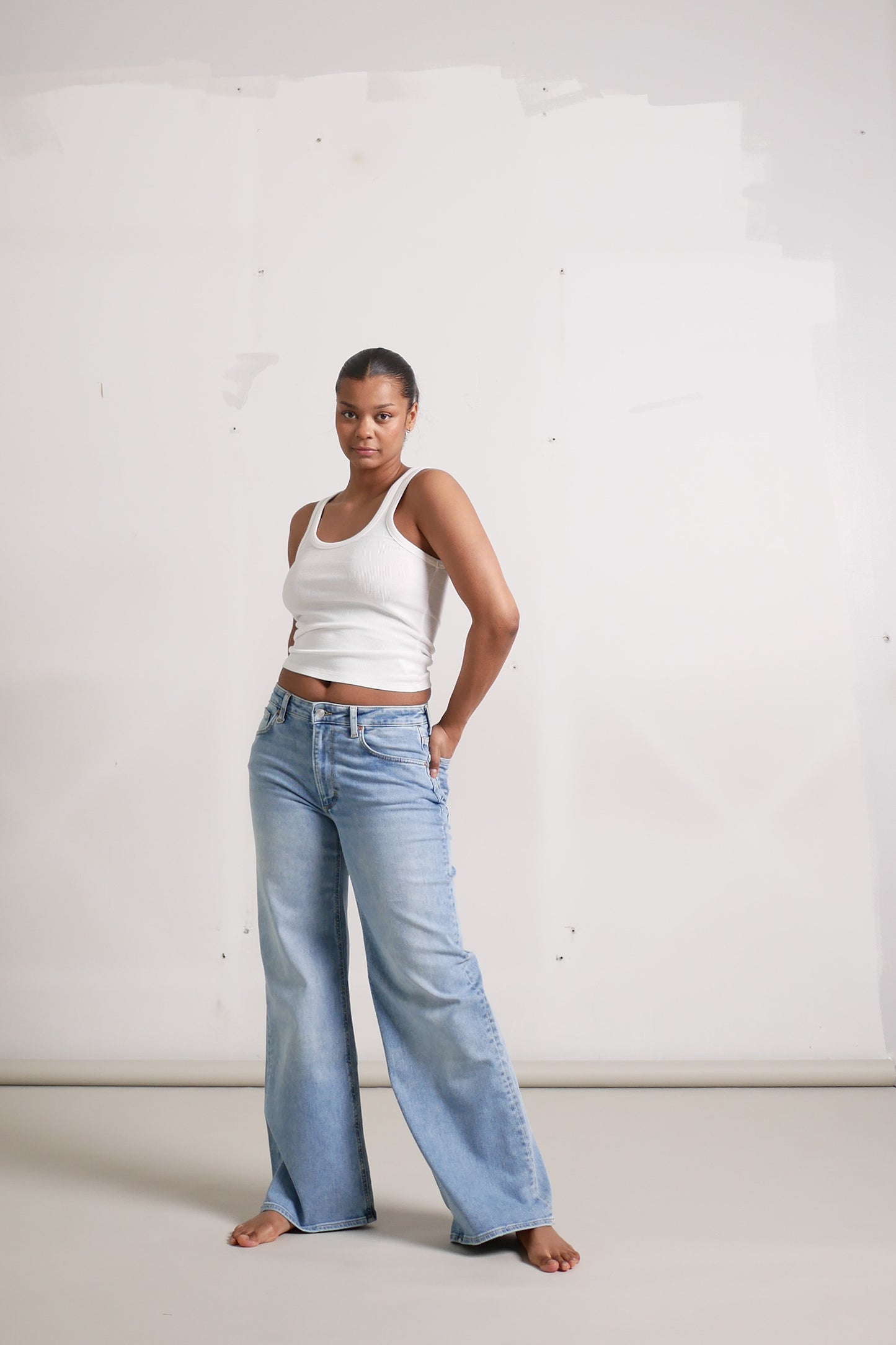 Naisten upeat leveälahkeiset farkut raikkaassa ja kulutetussa vaaleansinisen sävyssä. Farkuissa pitkät ja väljät lahkeet jotka levenevät A-mallisena polvesta alas sekä keskikorkea ja istuva vyötärö. Materiaalina jämäkkää denimkangasta joka joustaa hieman ja tekee farkuista mukavat päällä.