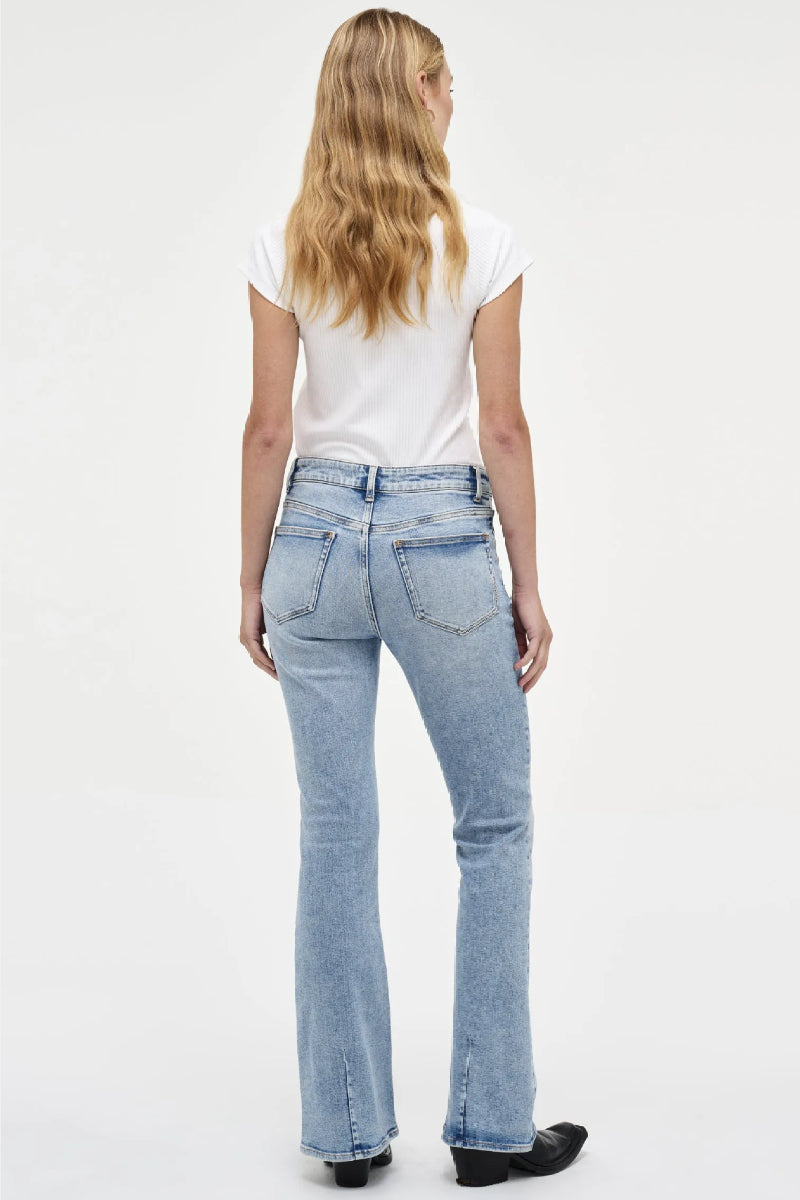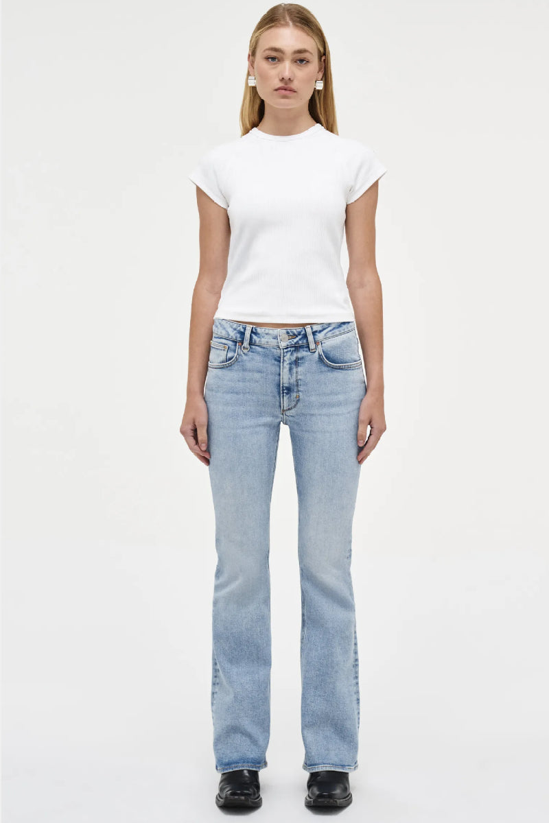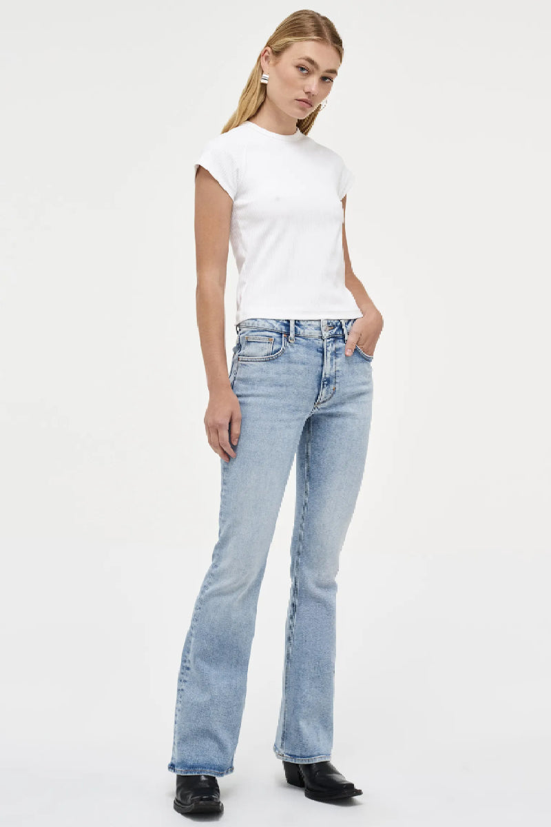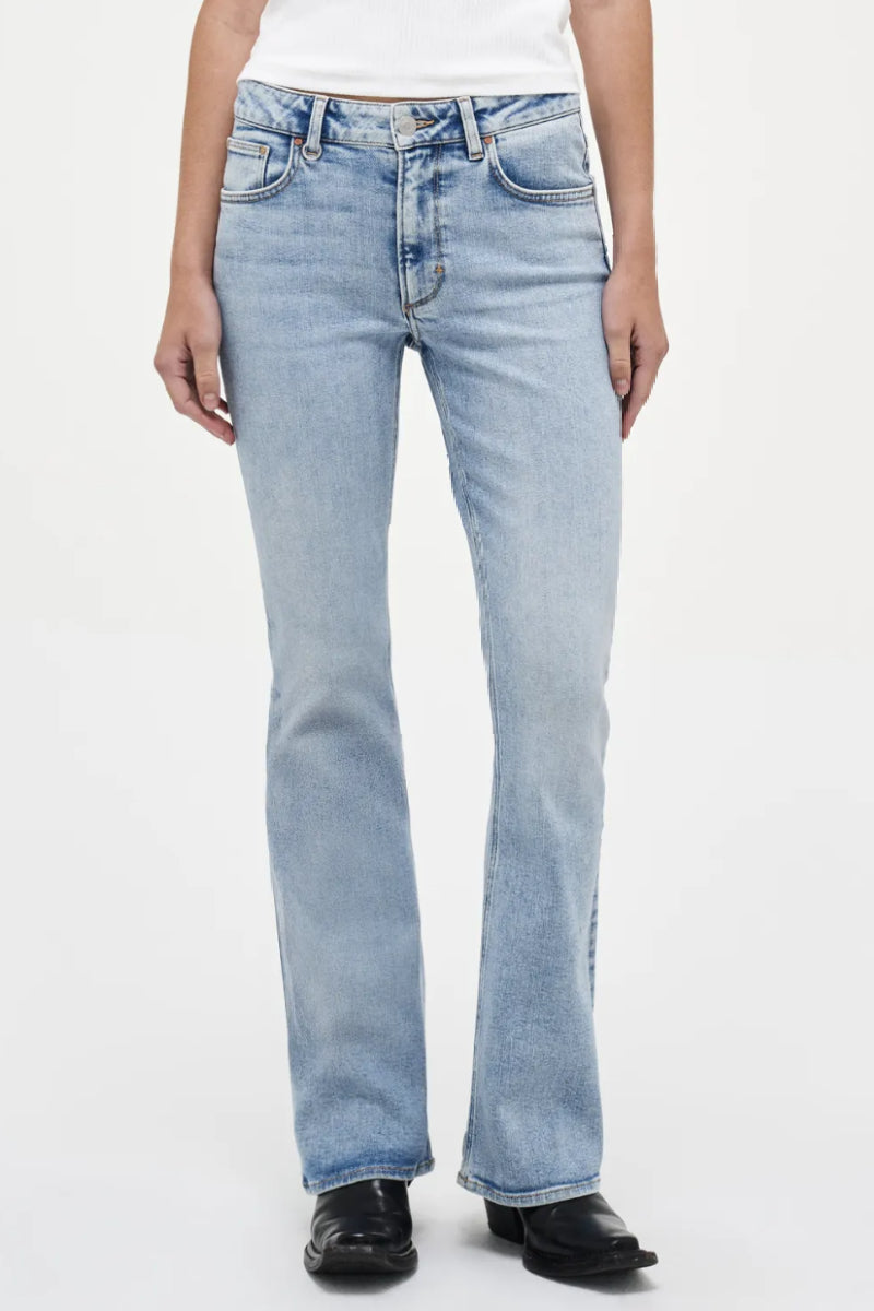 Upea kapealinjainen bootcut-mallinen farkku NEUWilta. Farkuissa keskikorkea vyötärö sekä raikas, kulutettu vaaleansininen pesu joka tuo farkkuihin rennon mutta huolitellun ilmeen. Materiaalina joustava ja laadukas puuvilladenimsekoite.
