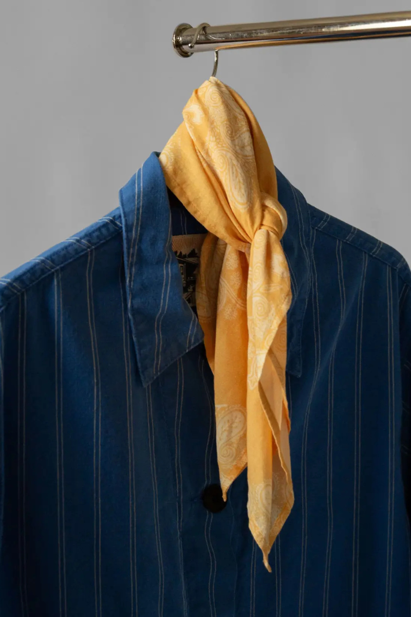 Luomupuuvillapopliinista valmistettu huivi ruotsalaiselta Nudielta. Huivissa paisley-printtikuvio upeassa tummansinisessä denimfiilistä henkivässä värissä.