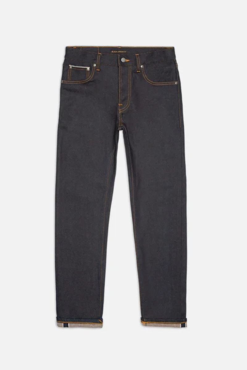 Slim-fit-farkut, joissa on mid waist -vyötärö ja suora lahje. Valmistettu 13,5 unssisesta joustavasta turkkilaisesta selvedge-denimistä, jossa on selkeät, diagonaaliset twill-linjat, hienoinen loimilangan slub-efekti ja syvä, tumma indigonsävy. Kulutukselle alttiissa kohdissa pinta tasoittuu ja twill erottuu selkeästi, kun taas vähemmän kuluvilla alueilla denim rypistyy ja muodostaa kauniin, rakeisen “salt ’n pepper” -pinnan. Näiden pintojen kontrasti tekee kankaasta erityisen ja tuottaa rikkaan, vaihtelevan patinan käytössä.