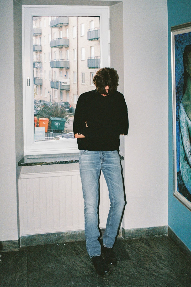 Kapealahkeiset, slim fit -farkut keskikorkealla vyötäröllä ja suoralla lahkeella kirkkaan sinisessä pesussa, jossa on lähes valkoiset, lämpimään taittuvat korostukset. Näissä vaaleansinisissä farkuissa yhdistyvät moderni istuvuus ja laadukkaat yksityiskohdat. Denimin hieman epätasainen, slubby-tekstuurinen pinta korostuu kulutetuissa kohdissa, kun taas tummemmat alueet paljastavat selkeät twill-viivat.