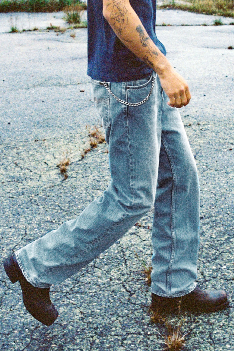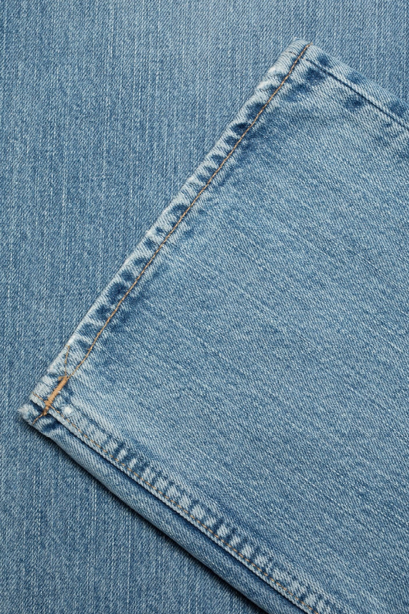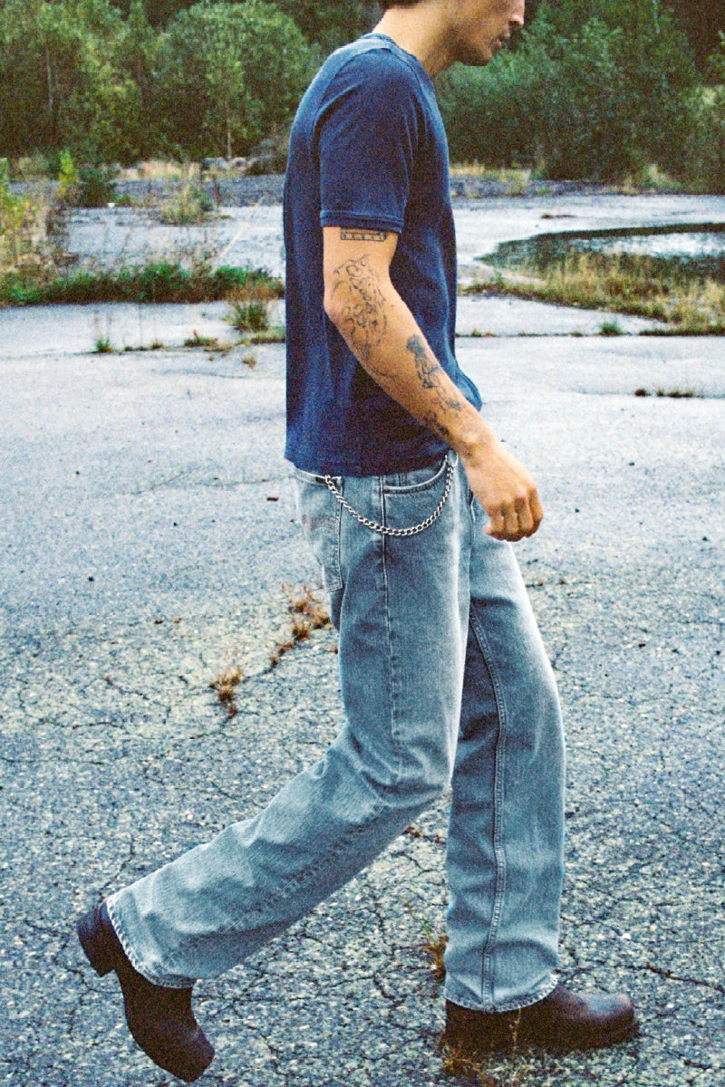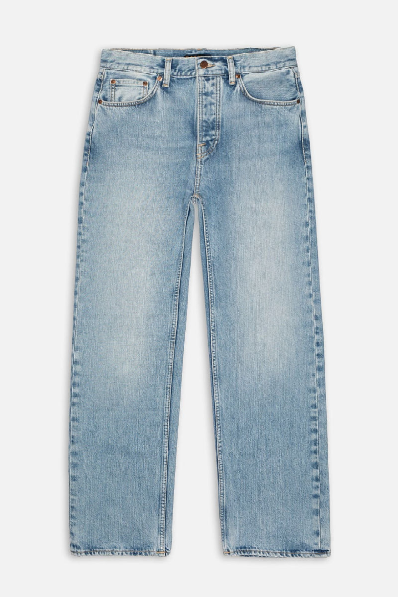 Leveälahkeiset ja näyttävästi kulutetut farkut Nudie Jeansilta. Huippulaadukkaasta denimkankaasta valmistetuissa farkuissa on huoleton istuvuus, vintage-henkinen pesu ja hieno viimeistely. Kangas on näyttävää, raitamaista denimiä, jossa vaihtelevan paksuiset pystysuuntaiset langat luovat elävän pinnan. Myös hienovarainen ristikkäinen kuvio syventää kankaan ilmettä. Pesussa matalat kohdat korostuvat tummempina ja vaaleammat osat hehkuvat kuin auringon haalistamina.