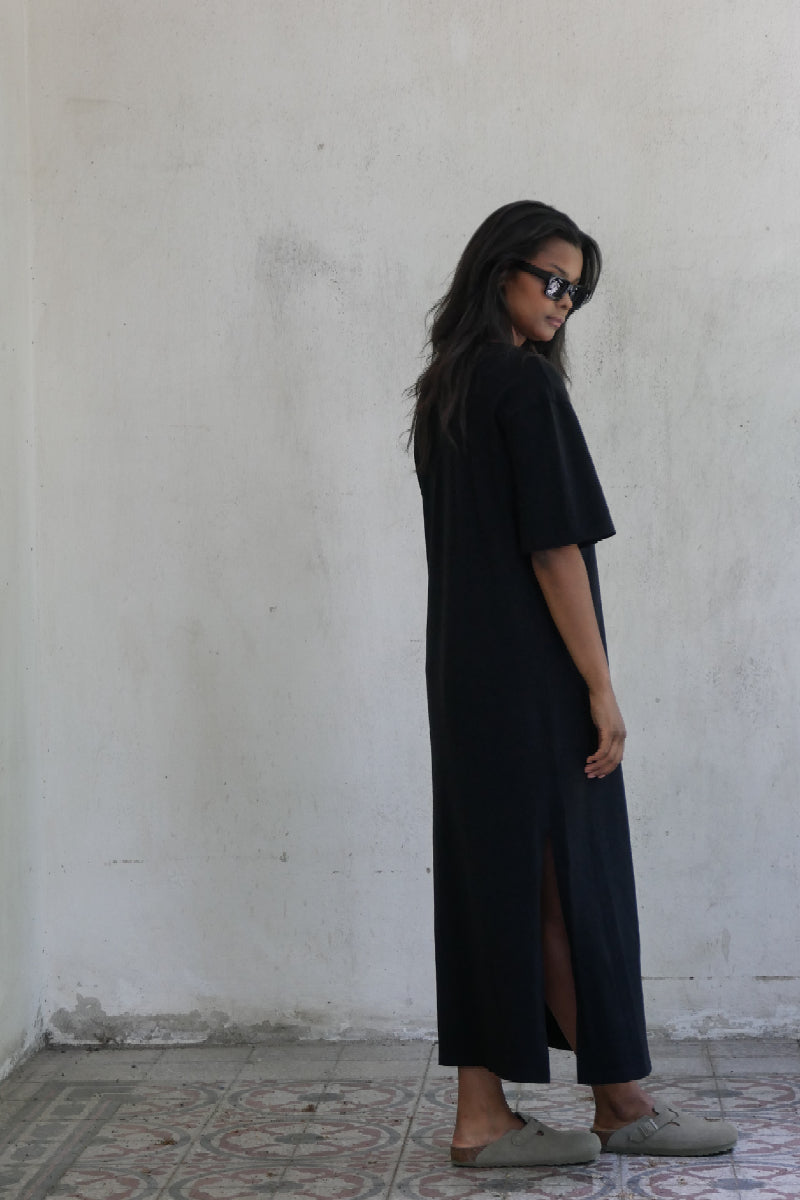 OUNCE garments Indie on ihanan rento maxi-pituinen mekko tiputetuilla olkapäillä, runsailla hihoilla ja naisellisilla sivuhalkioilla. Sileäpintainen joustava neulos tuntuu ylellisen kepeältä päällä.