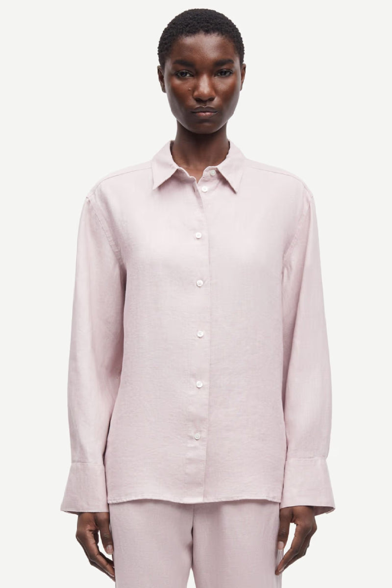 Rennosti istuva pitkähihainen pellavapaita tanskalaiselta Samsøe Samsøelta. Paidassa lasketut olkapäät, edessä klassinen nappilista ja hihansuissa napit. Materiaalina käytetty pellava tekee siitä kevyen ja hengittävän valinnan niin arkeen kuin lomatyylin viimeistelyyn.