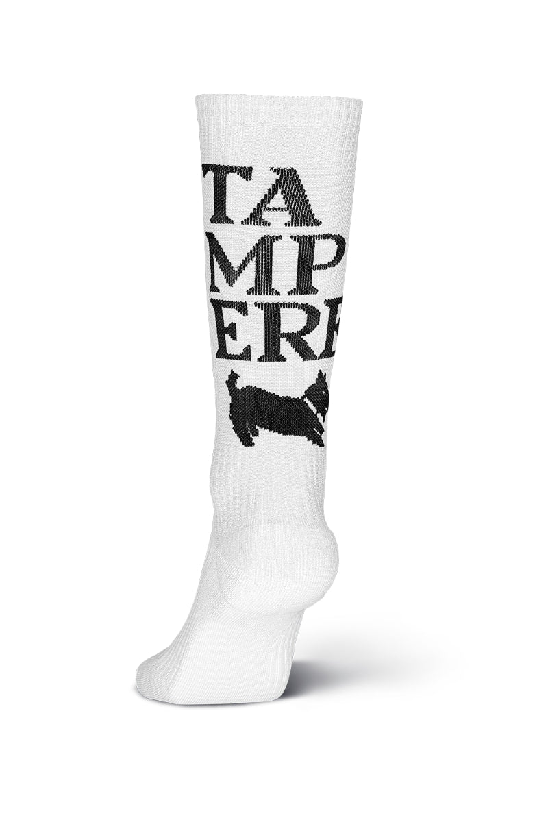 Valkoiset luomupuuvillasukat Tamperelaiselta Sidosteelta. Sukissa suuri kotiseuturakkautta henkivä Tampere-teksti sekä sidosteen logo.