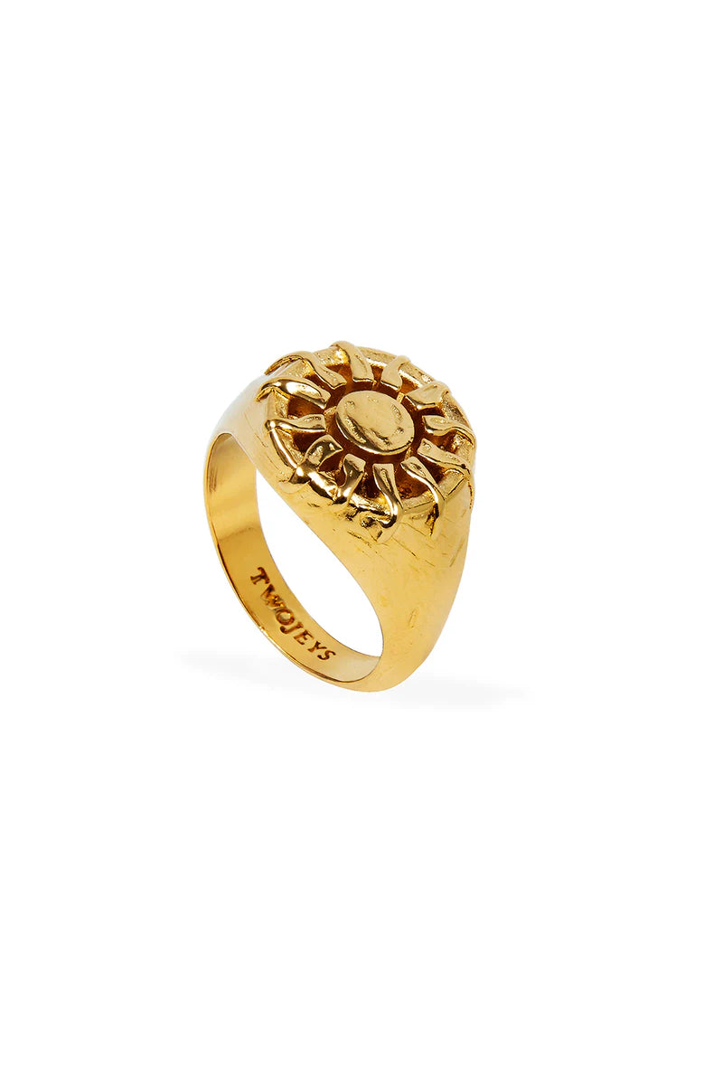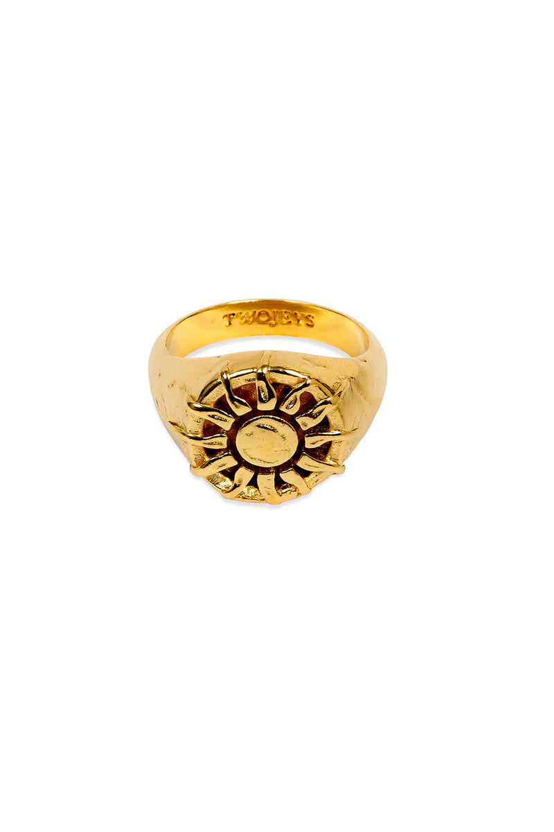 Käsintehty kantasormus barcelonalaiselta Twojeysilta. Messinkisormus on päällystetty kullalla ja sen sisäpuolelle on kaiverrettu Twojeys-logo.