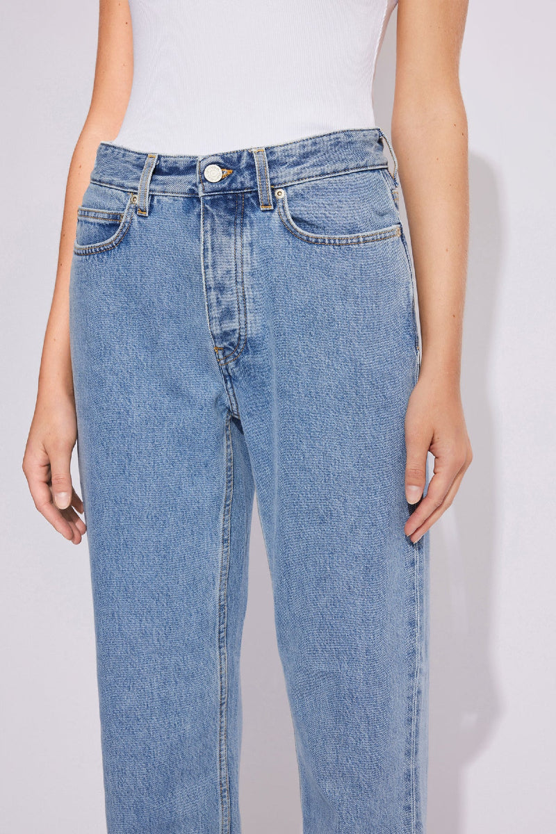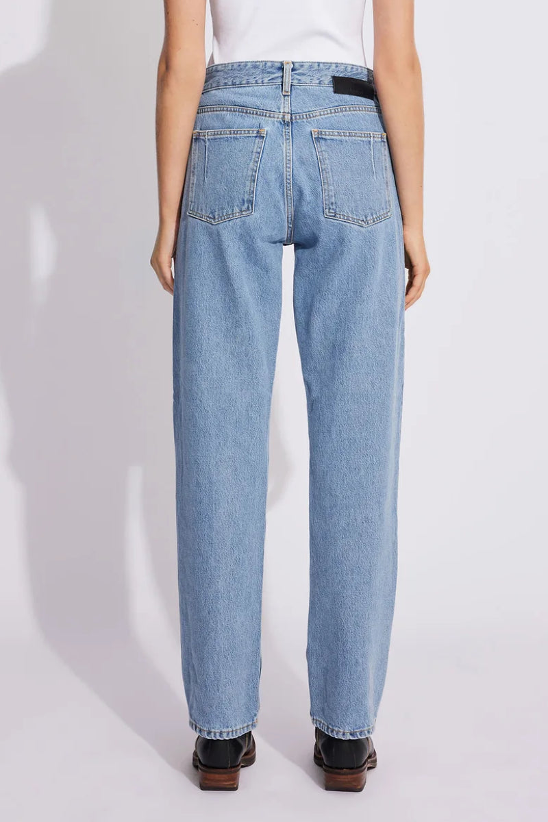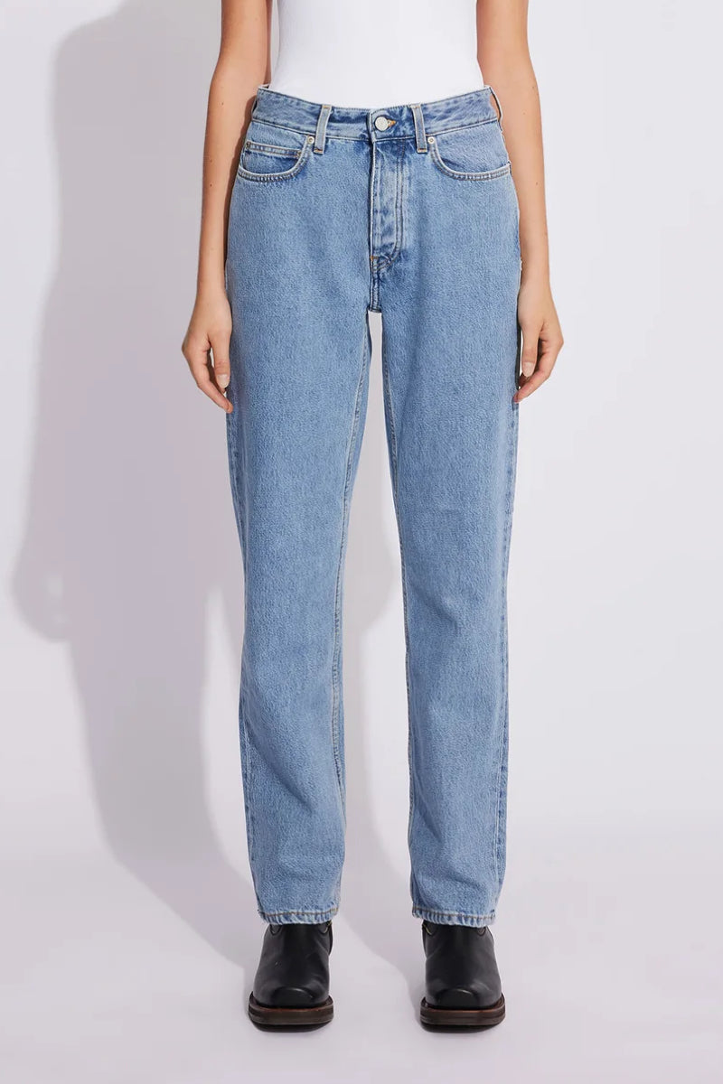Rennonmallinen 'mom fit'-farkku Won Hundredilta. Valmistettu Italiassa. Jämäkkä ja joustamaton kangas on 14-unssista puuvilladenimiä. Korkea vyötärö sekä hieman nilkkaa kohden kapeneva ja cropattu lahje. Klassinen viistaskumalli tyylikkäillä nimikoiduilla napilla ja riveteillä. Pesuna raikas vaaleansininen indigo.